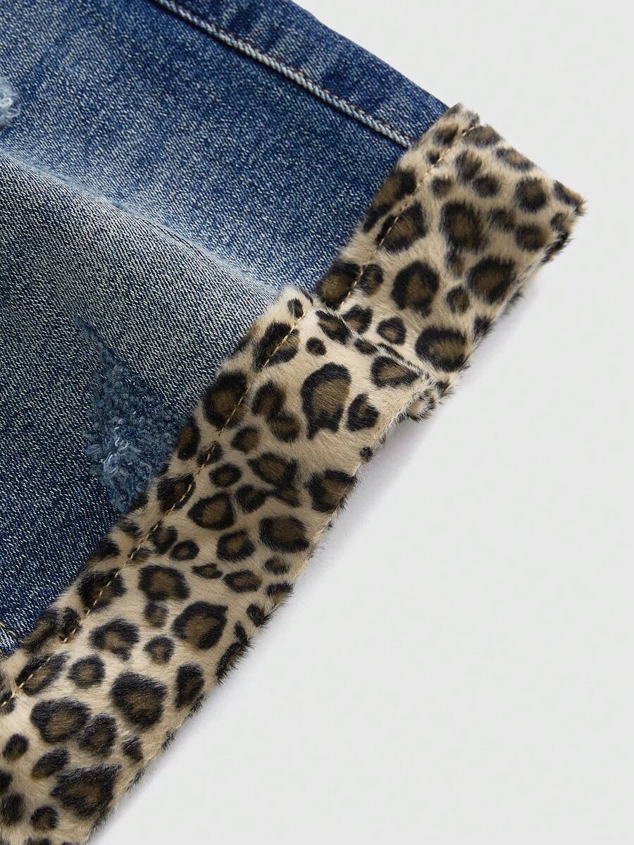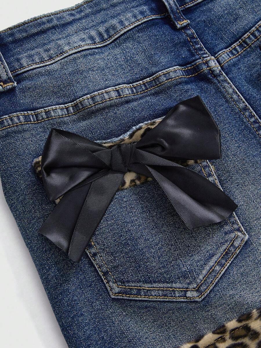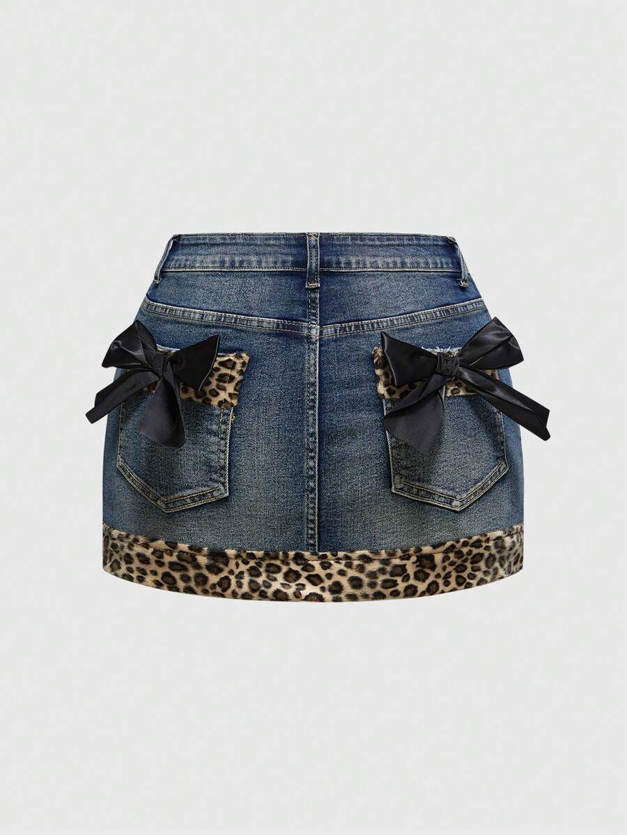 Kawaii Back To School Y2K Aesthetic Furry Leopard Print Patchwork Bow Embellished Women's Denim Mini Skirt Leopard Trim Denim Skirt