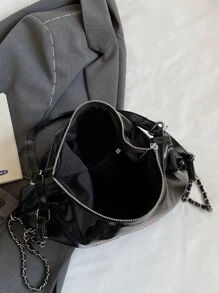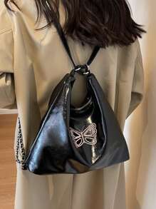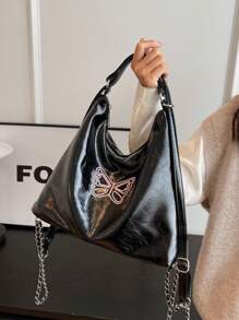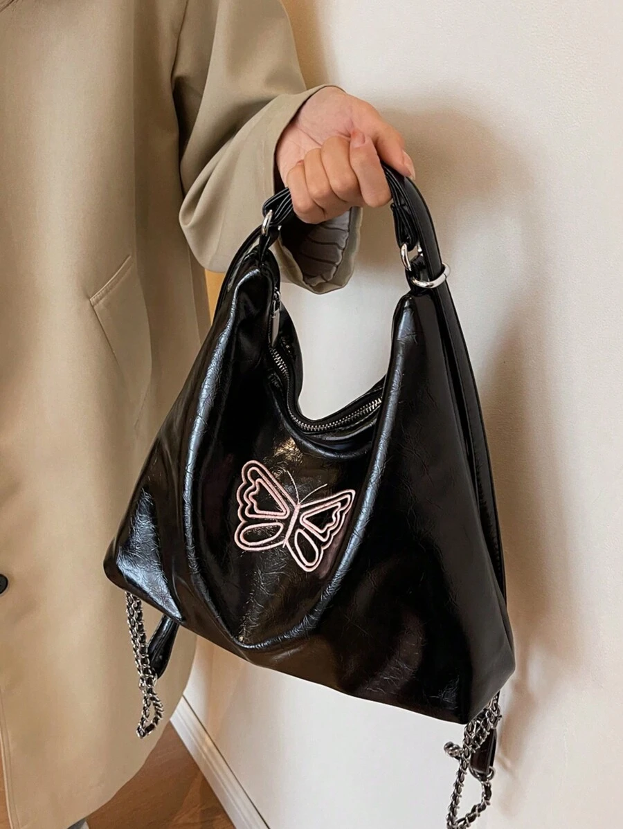 Kawaii Black Butterfly Embroidery Chain Shoulder Bag For Women, Fashion Crossbody Bag, Large Capacity Commuter Bag