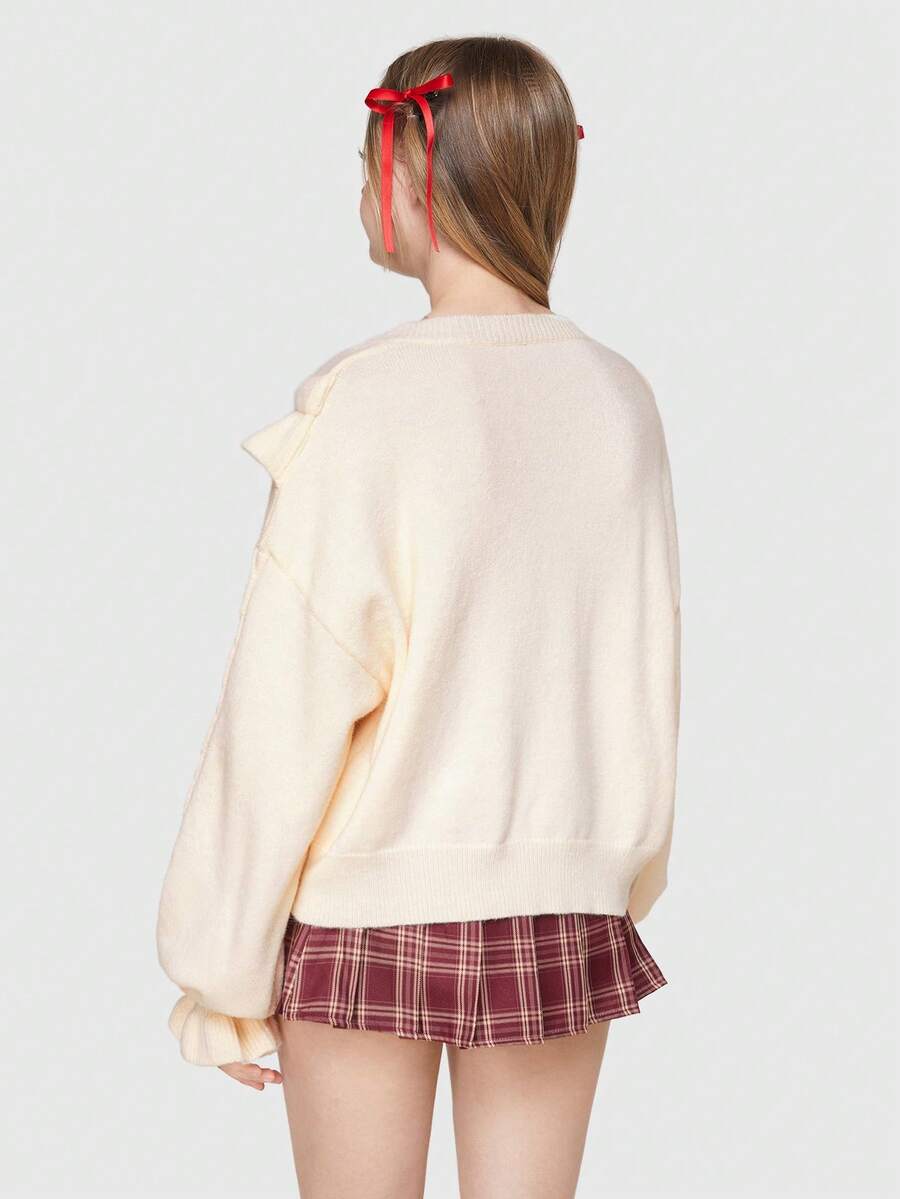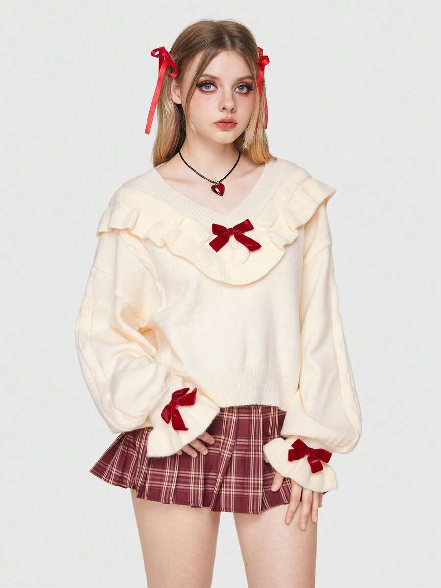 Kawaii Bow Ruffled V-neck Sweater Pullover