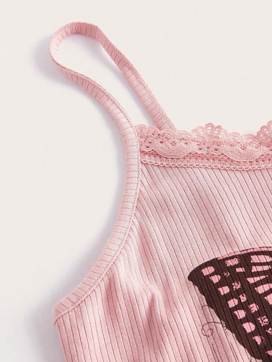 Kawaii Butterfly Print Contrast Lace Cami Top