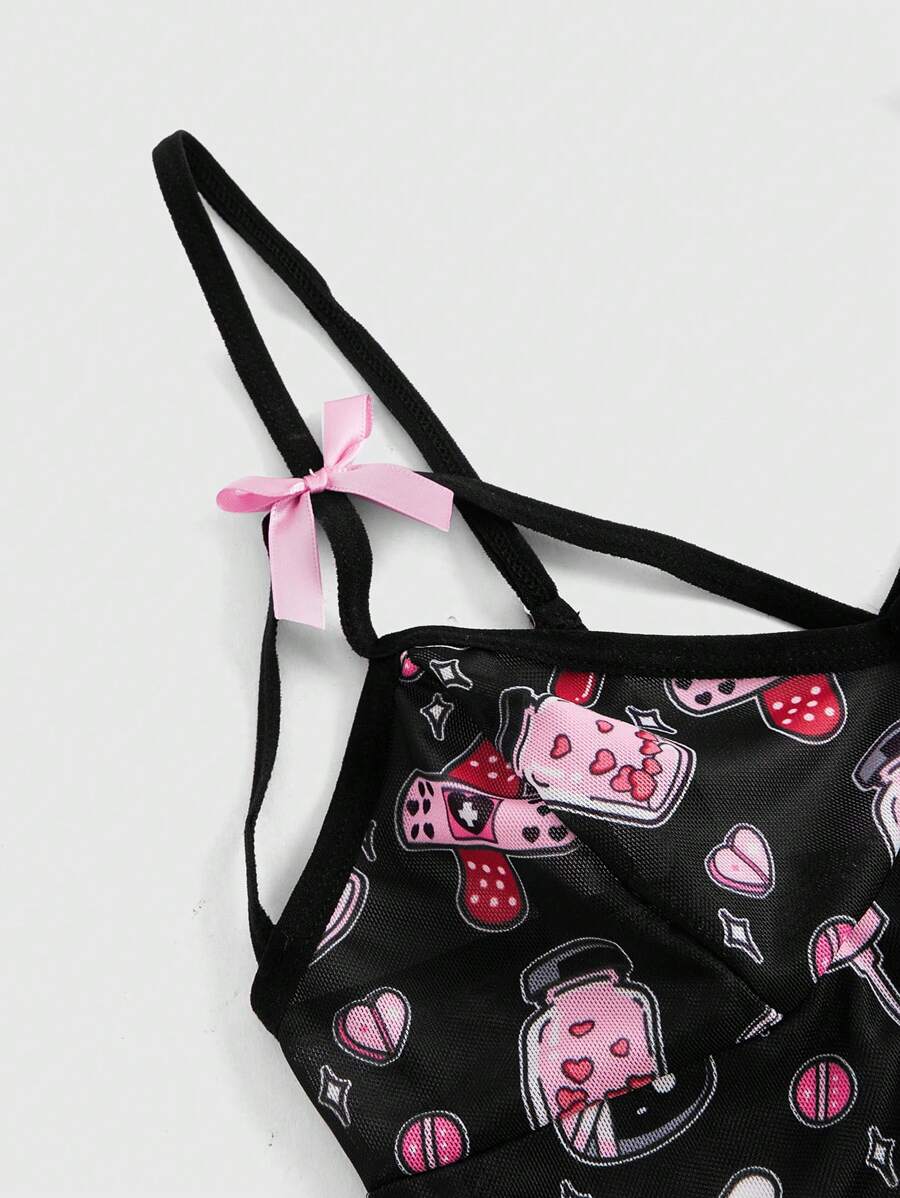 Kawaii Cartoon Print Harness Mesh Teddy Bodysuit