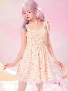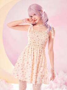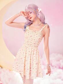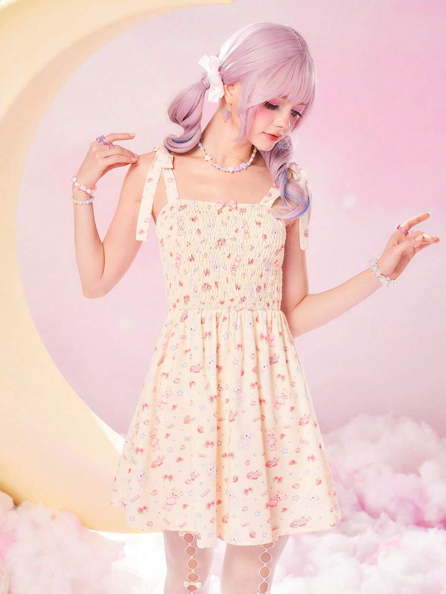 Kawaii Cartoon Print Tie Shoulder Shirred Cami Dress