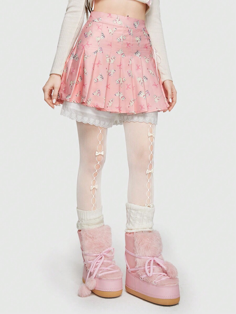 Kawaii Cat Print Lace Up Pleated Skirt