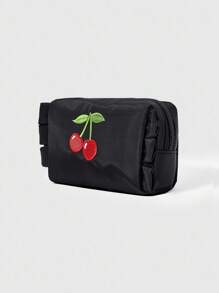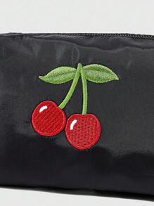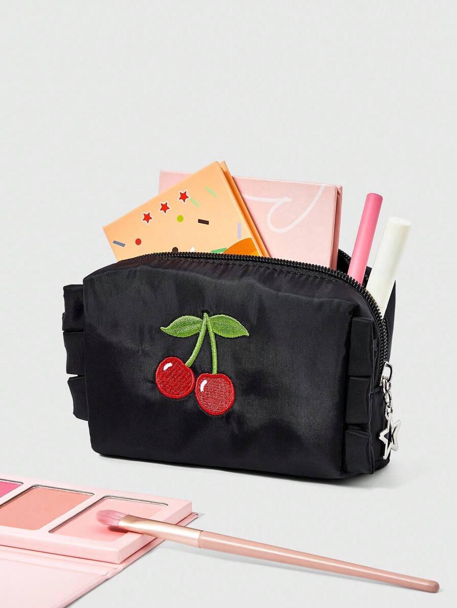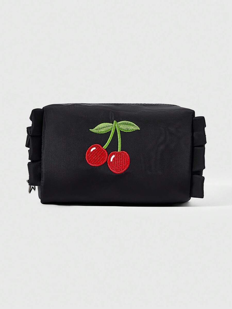 Kawaii Cherry Embroidery Cute Ruffle Trim Portable Cosmetic Bag