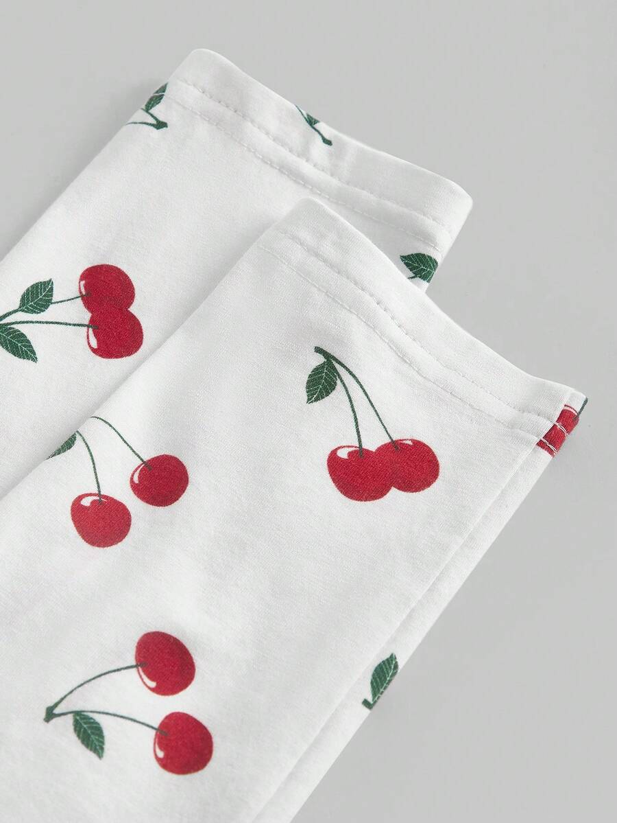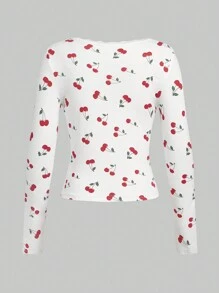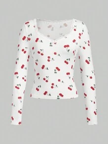 Kawaii Cherry Print Contrast Trim Bow Detail Tee