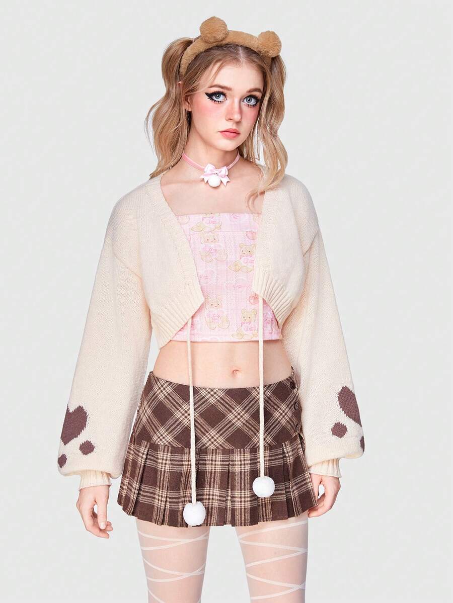 Kawaii Claw Print Drop Shoulder Front Tie Sweater
