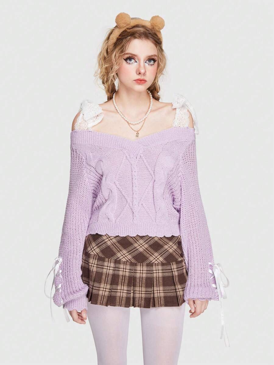 Kawaii Cold Shoulder Knot Cuff Cable Knit Sweater