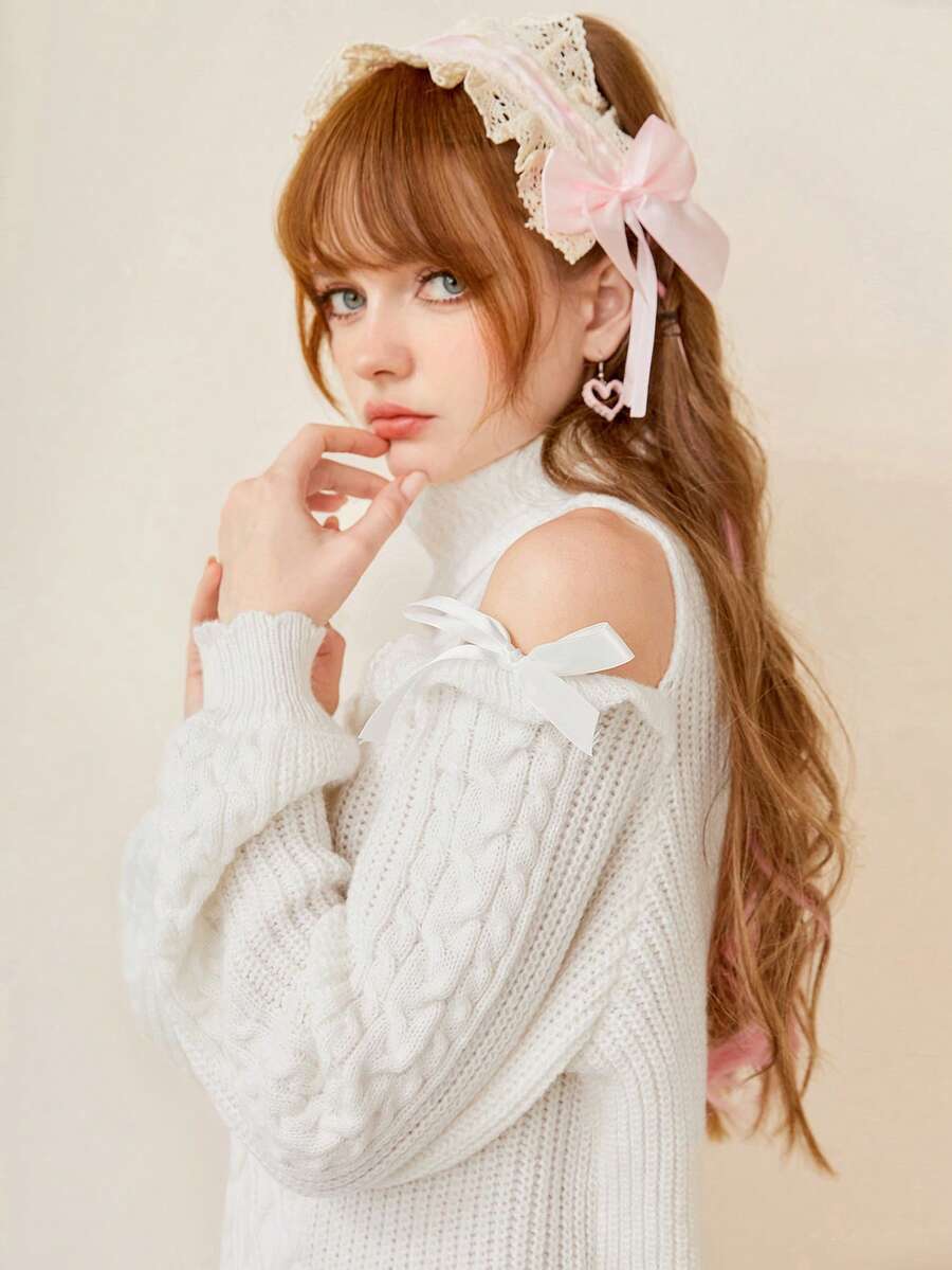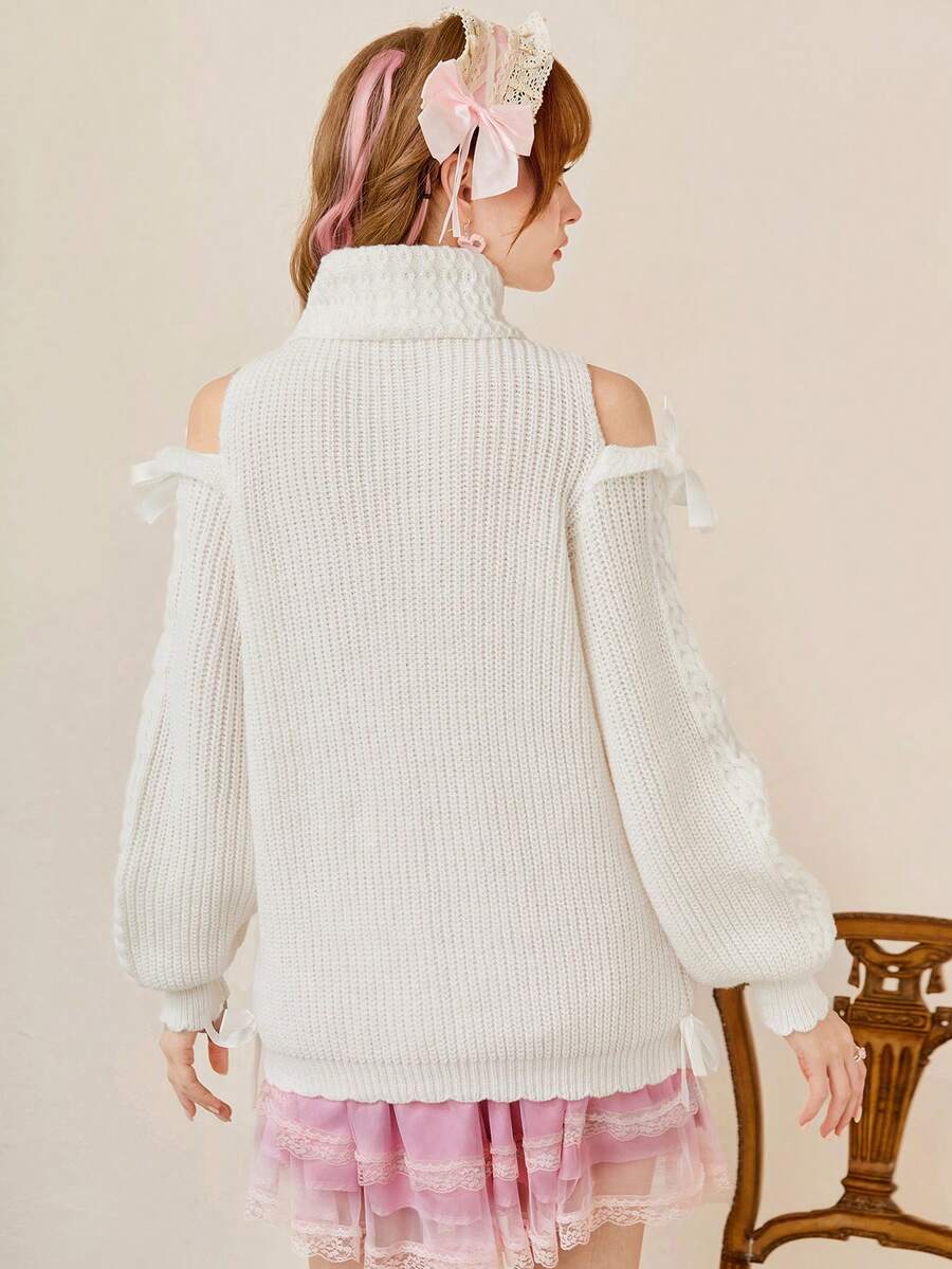 Kawaii Cold Shoulder Ruffle Trim Cable Knit Sweater