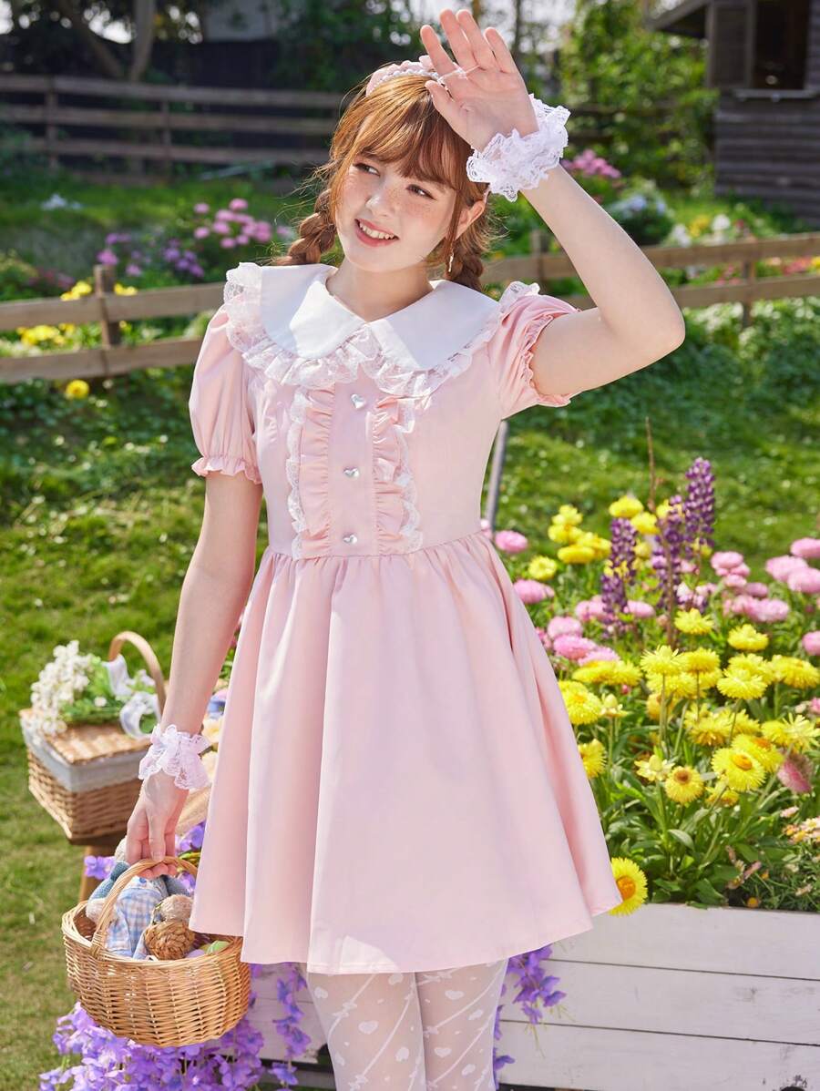 Kawaii Contrast Collar Ruffle Trim Puff Sleeve Dress