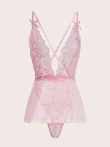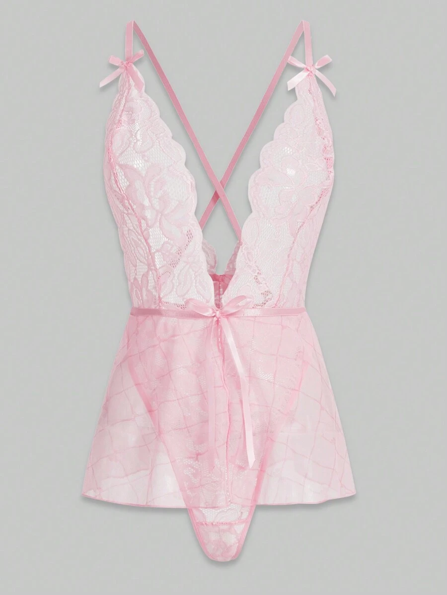 Kawaii Contrast Lace Criss Cross Bow Decor Teddy Bodysuit