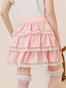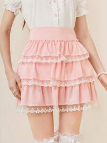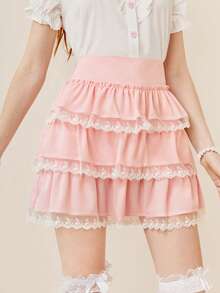 Kawaii Contrast Lace Ruffle Hem Skirt