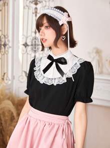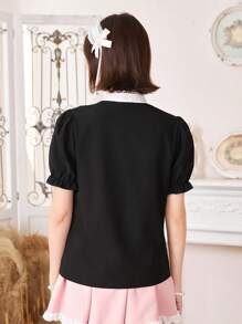 Kawaii Contrast Lace Ruffle Trim Puff Sleeve Blouse