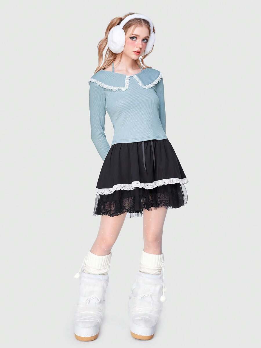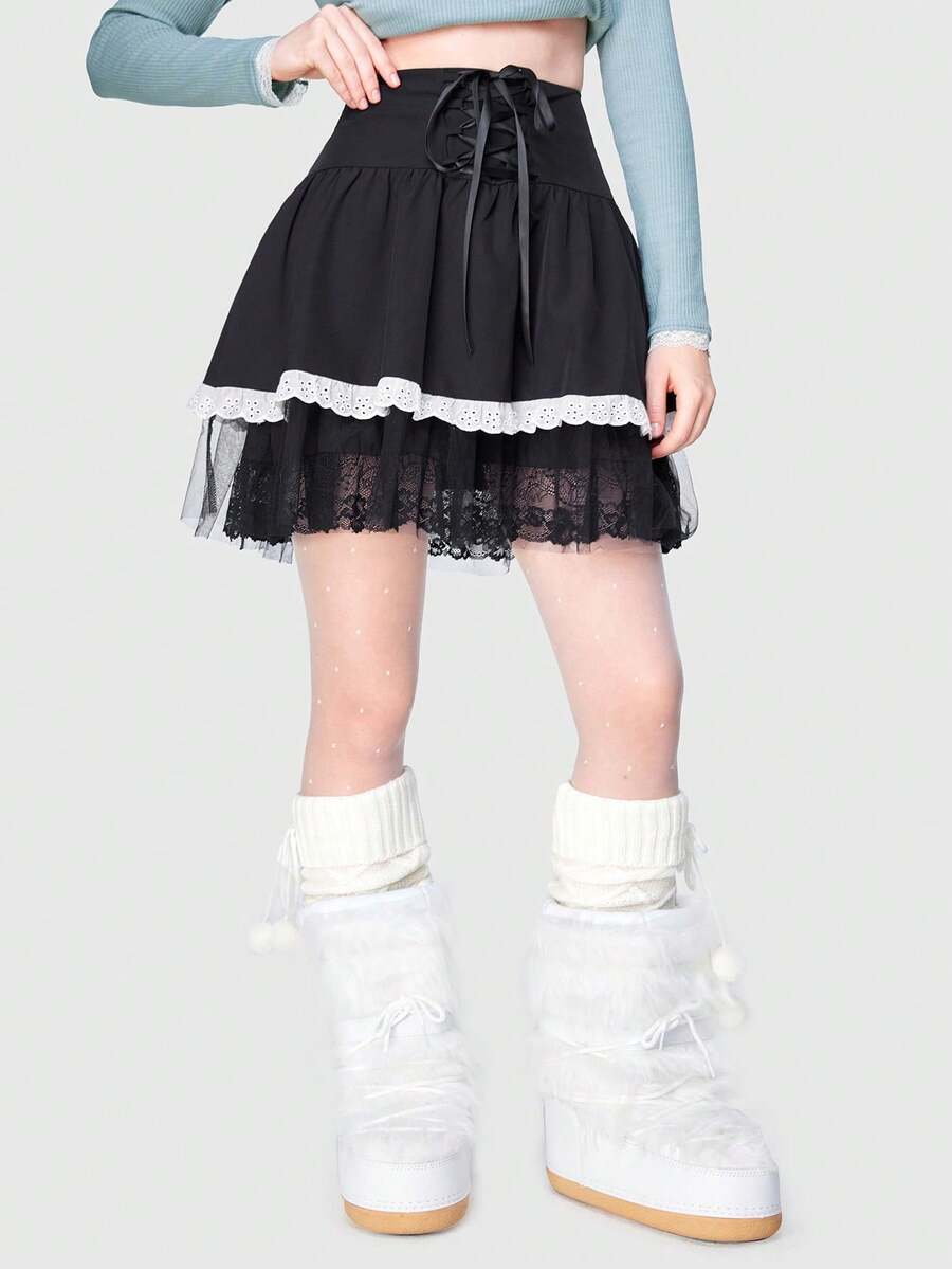 Kawaii Contrast Schiffy Lace Up Front Skirt