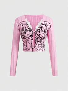Kawaii Cute Sweet Pink Anime Girl Print Contrast Lace Women Sweater