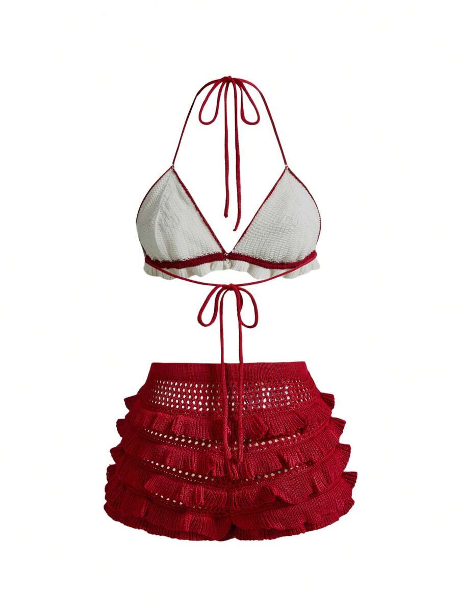 Kawaii Cute Vacation Halter Crochet Cherry Layered Cake Mini Skirt Knit 2 Pieces Set