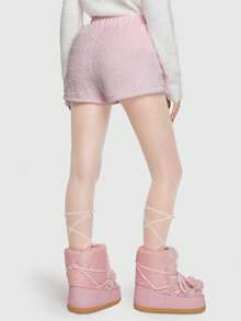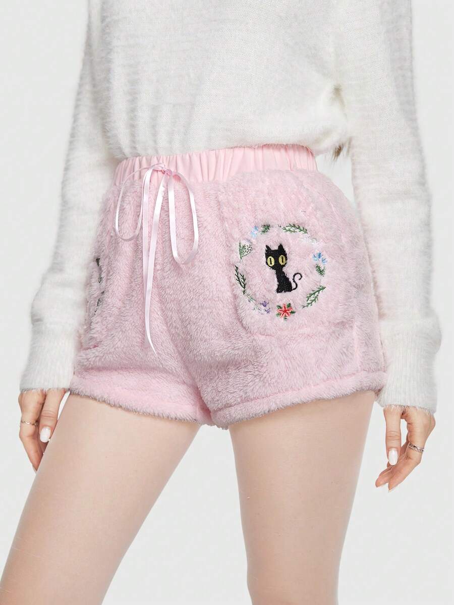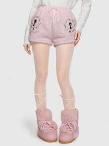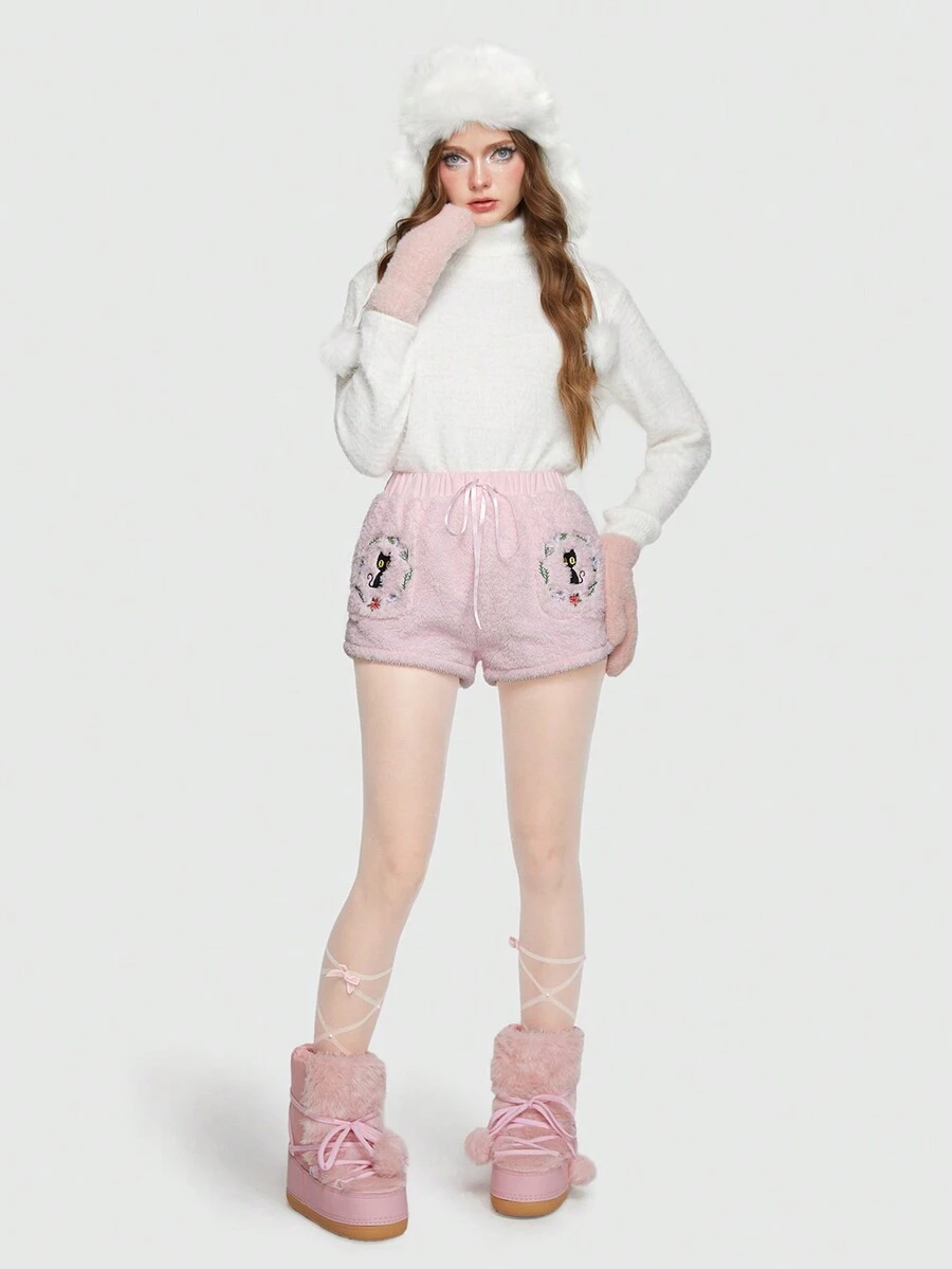 Kawaii Embroidery Cartoon Pattern Knot Elastic Waist Shorts