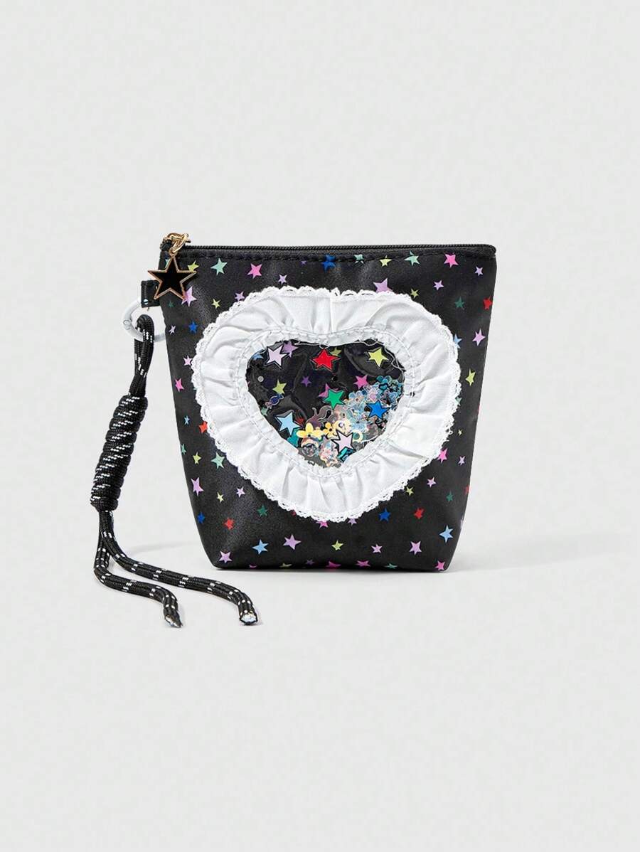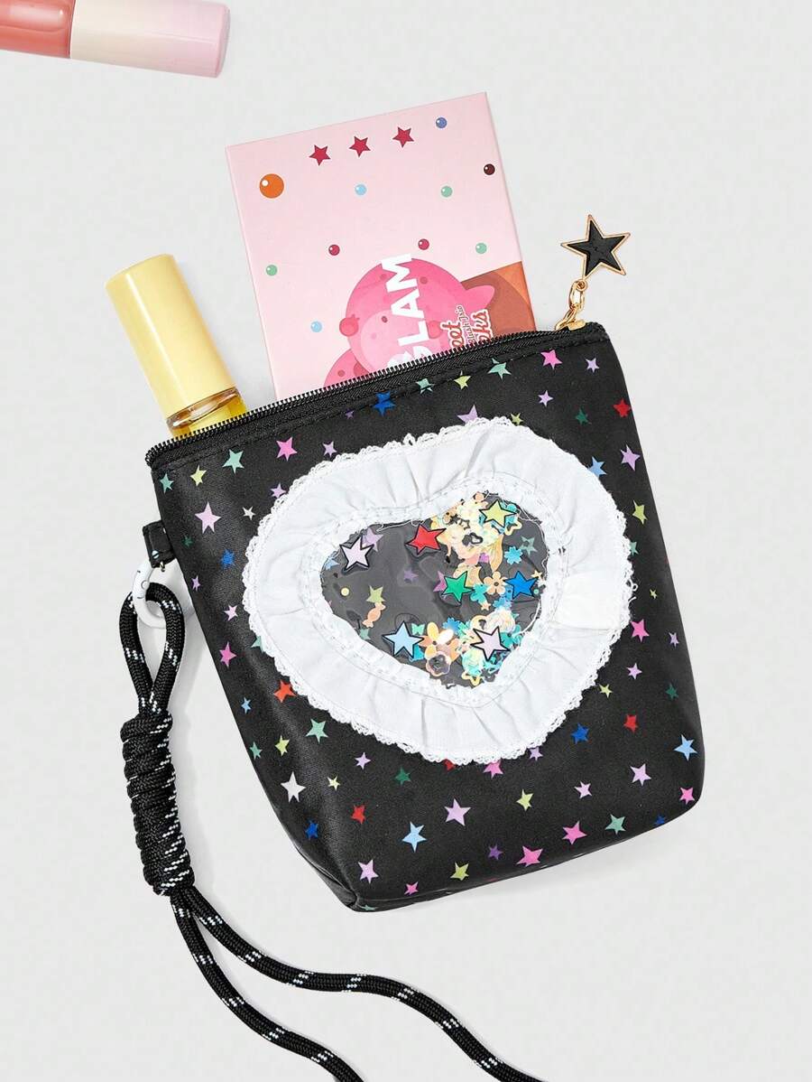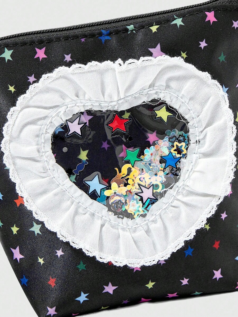 Kawaii Floral Lace Colorful Star Pattern Trapezoid Large Capacity Portable Cosmetic Bag, Item #1481690
