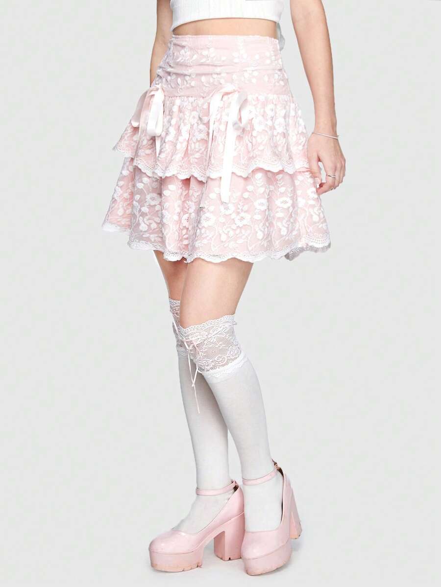 Kawaii Floral Lace Ruffle Trim Bow Front Layer Hem Skirt