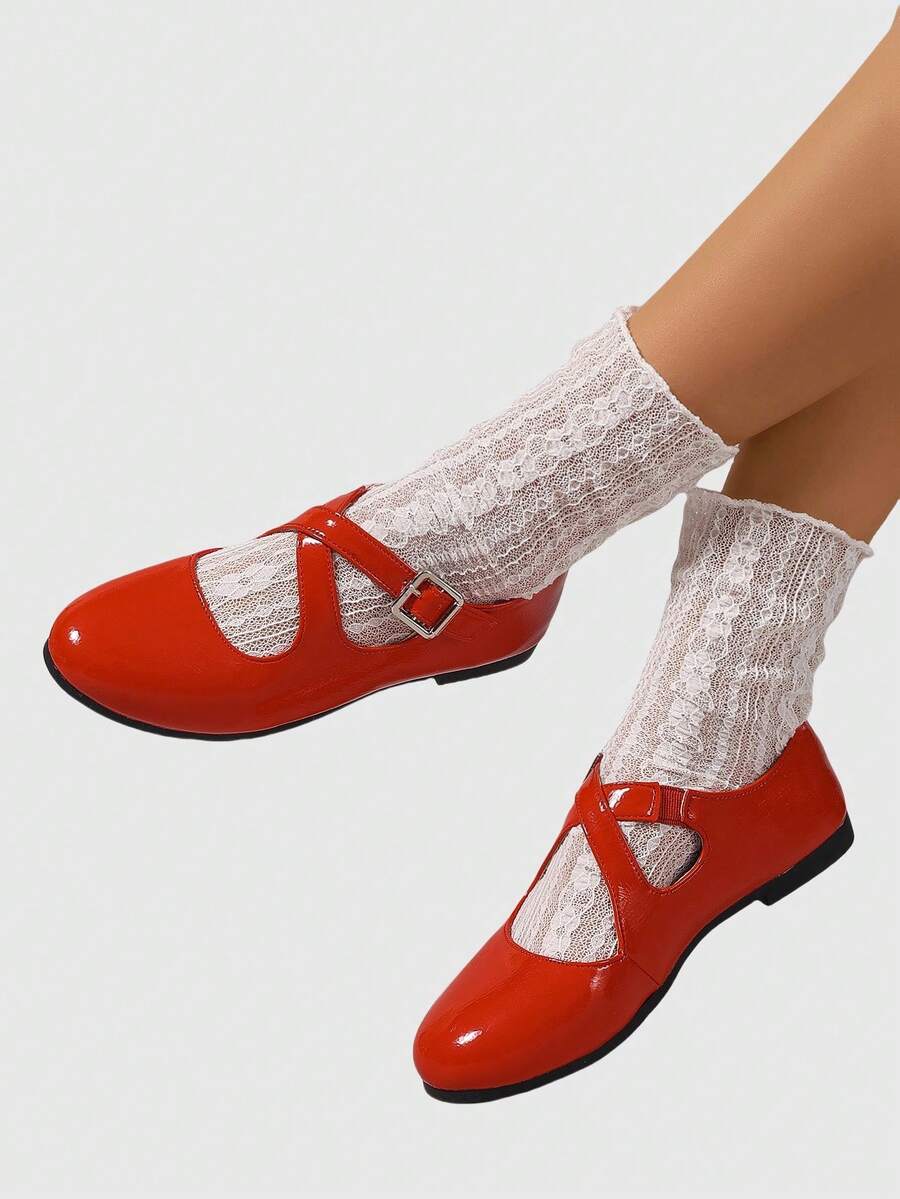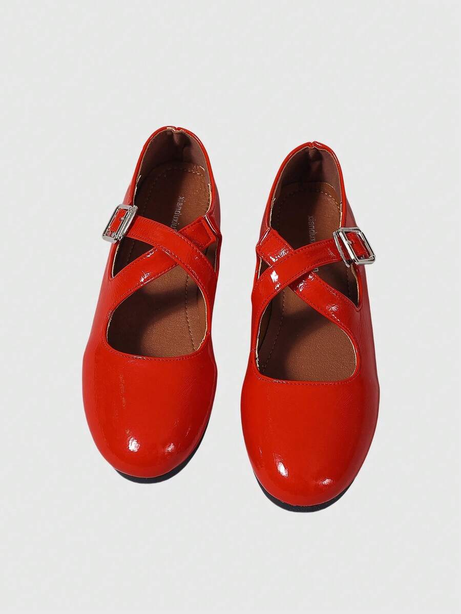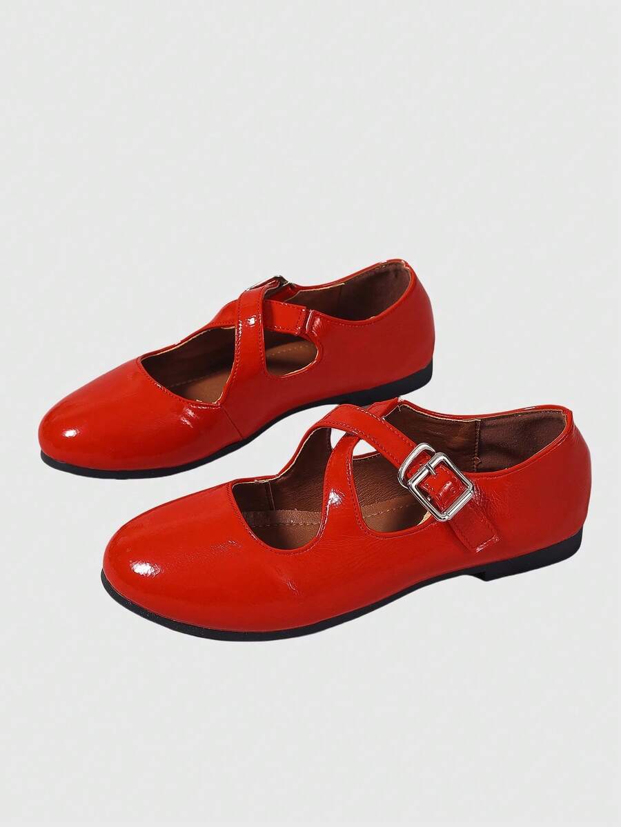 Kawaii French Retro Red Patent Leather Mary Jane Flats With Cross Strap And Buckle Design, Elegant British Style Versatile Red Leather Casual Shoes For Women