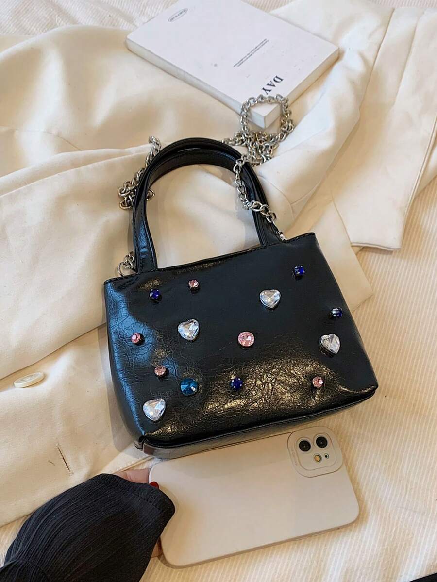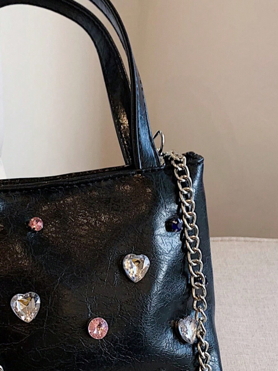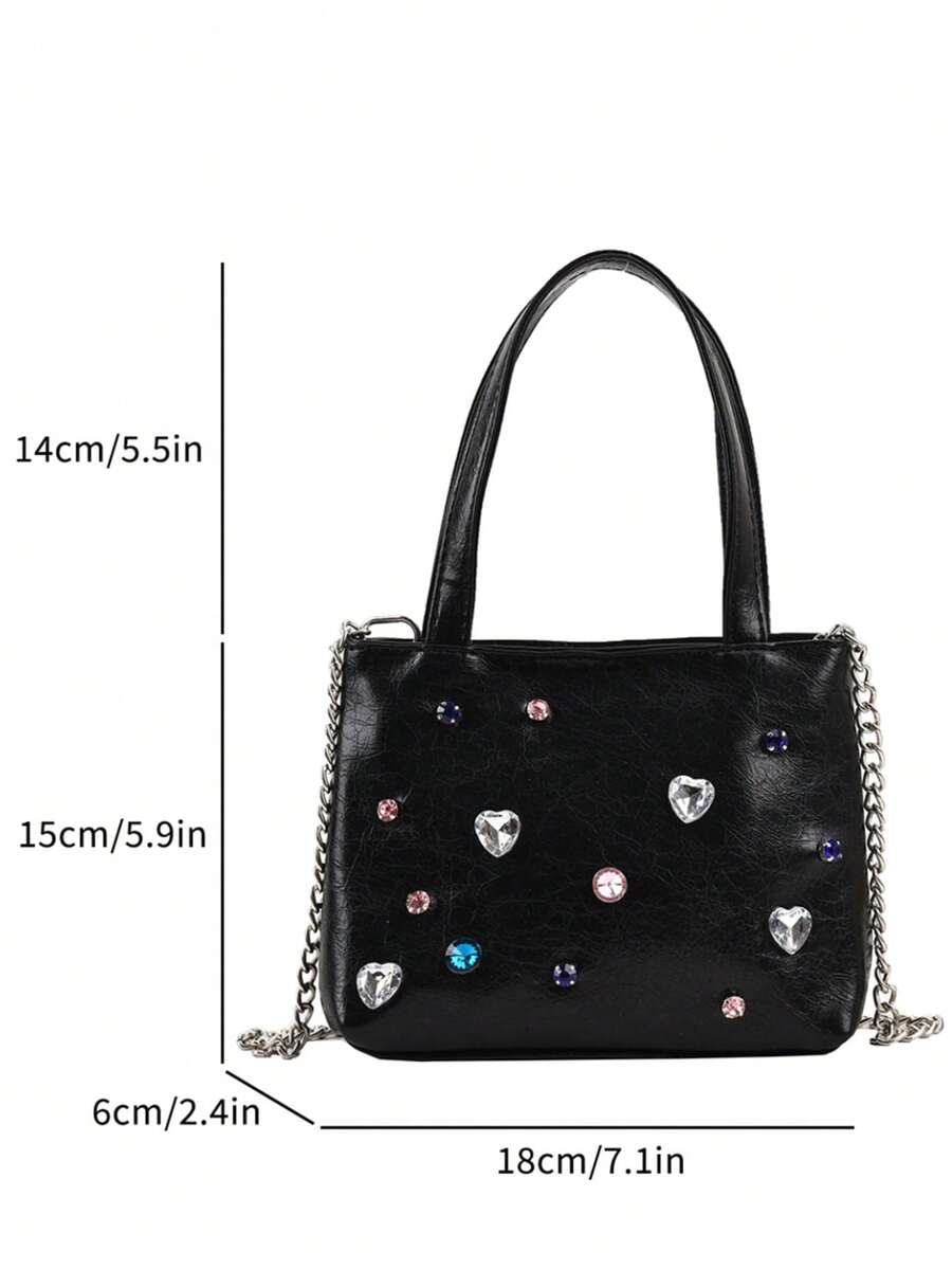 Kawaii Gothic Style Chain Leather Handbag With Rhinestone, Women's Shoulder Bag
