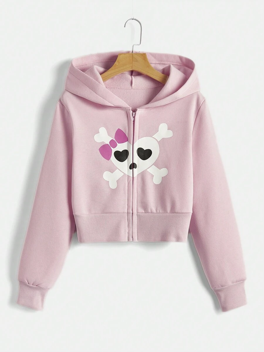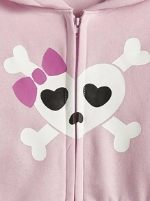 Kawaii Heart & Bow Print Zip Up Thermal Lined Hoodie