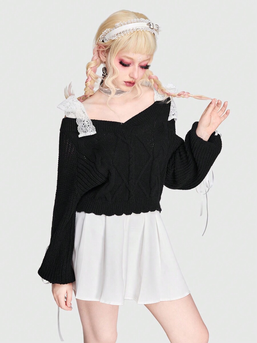 Kawaii Lace Up Tie Detail Scallop Hem Sweater