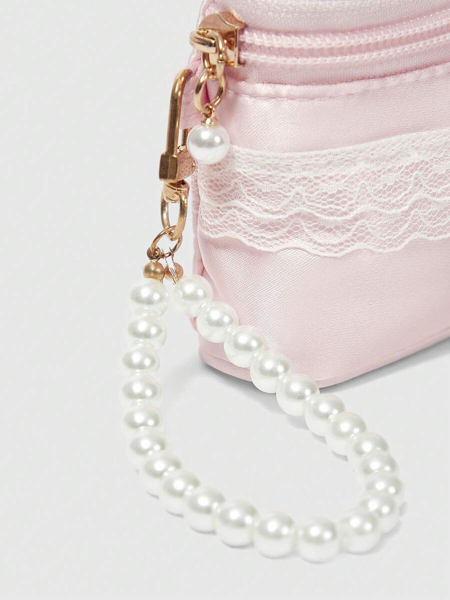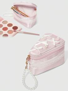 Kawaii Pearl Bow Cake Shaped Pink Cosmetic Bag, Mini Portable Girly Makeup Pouch