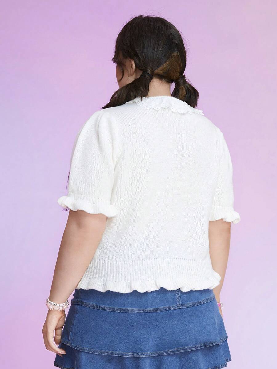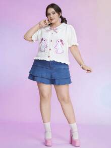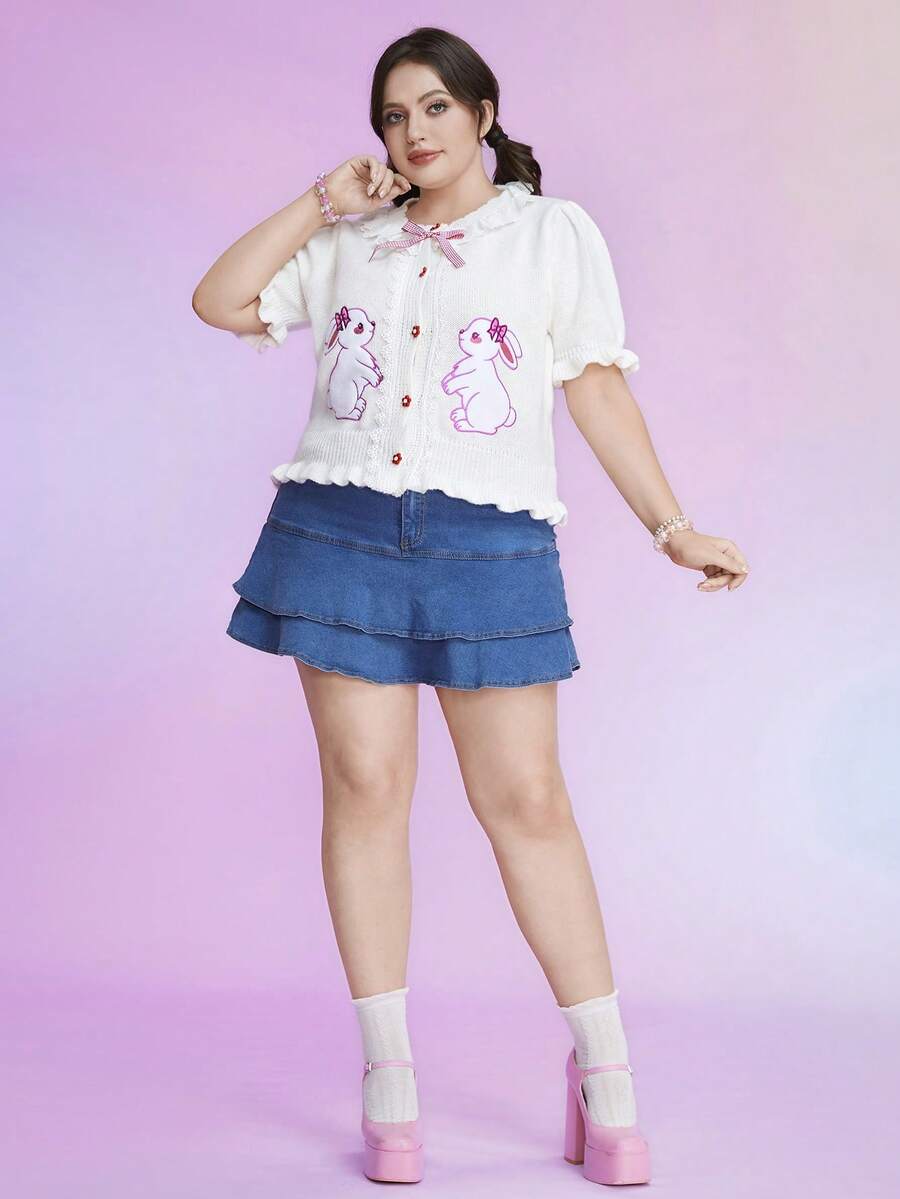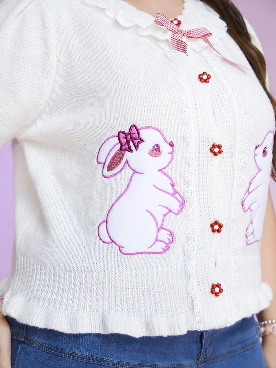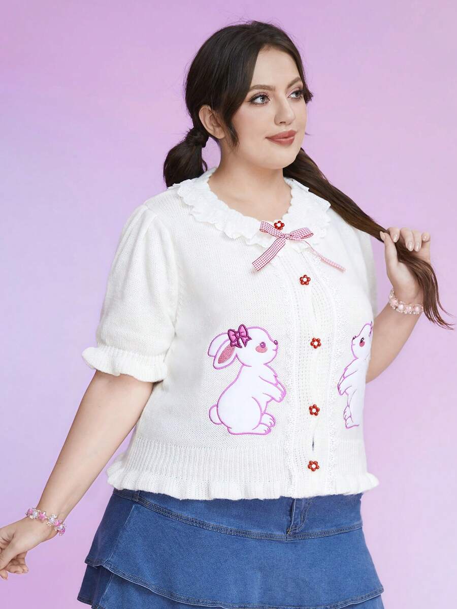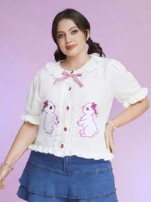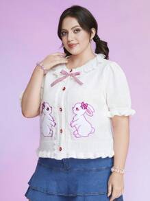 Kawaii Plus Cartoon Pattern Puff Sleeve Bow Front Cardigan