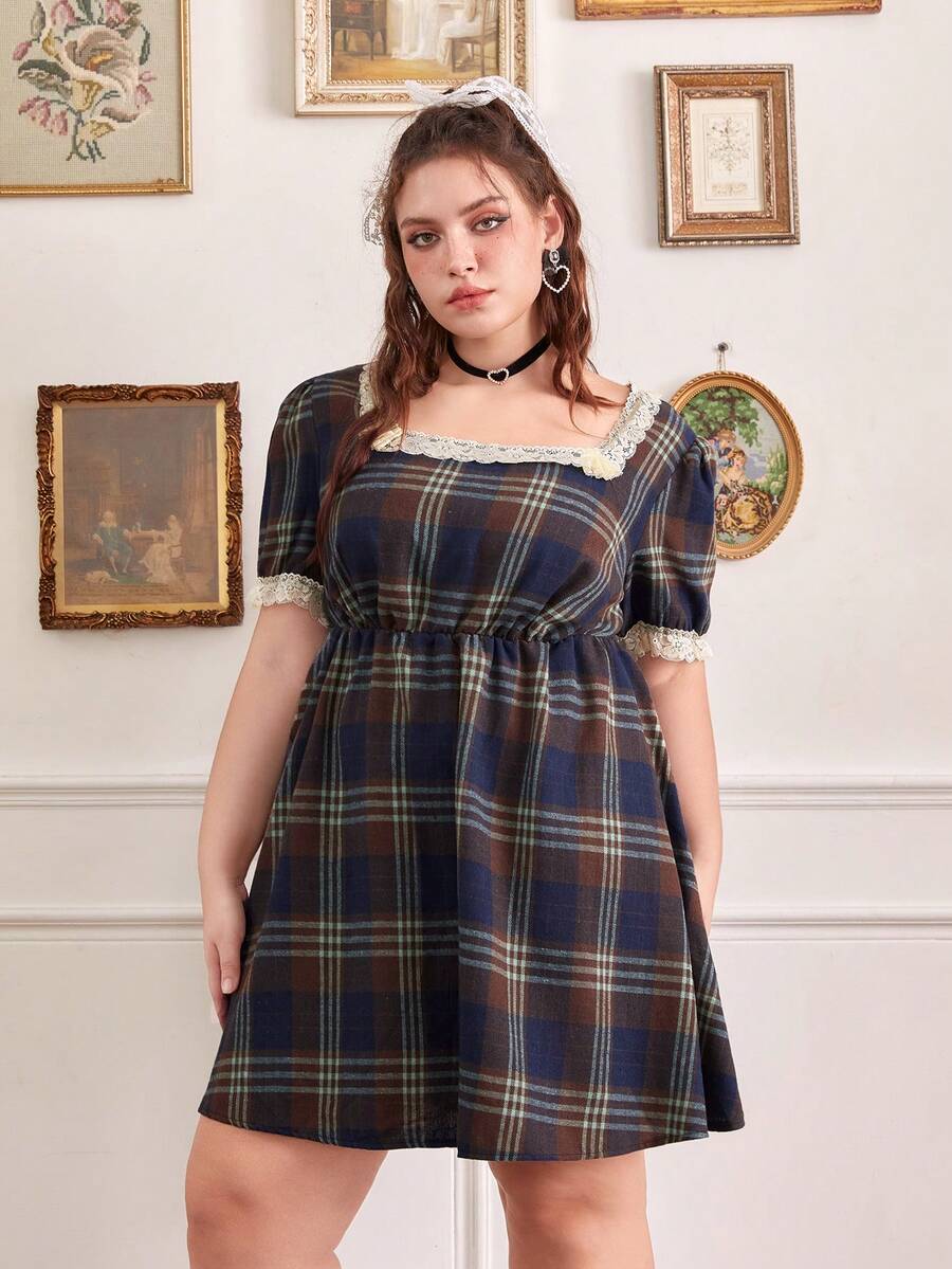 Kawaii Plus Plaid Print Contrast Lace Square Neck Dress