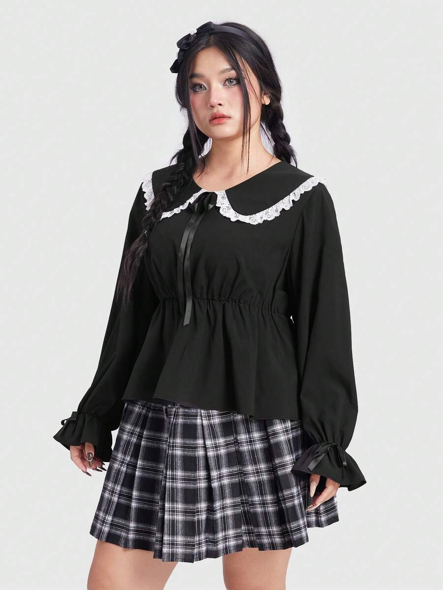 Kawaii Plus Size Ladies' Lace Trimmed Ruffle Hem Shirt