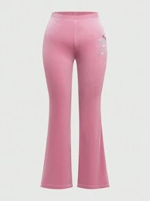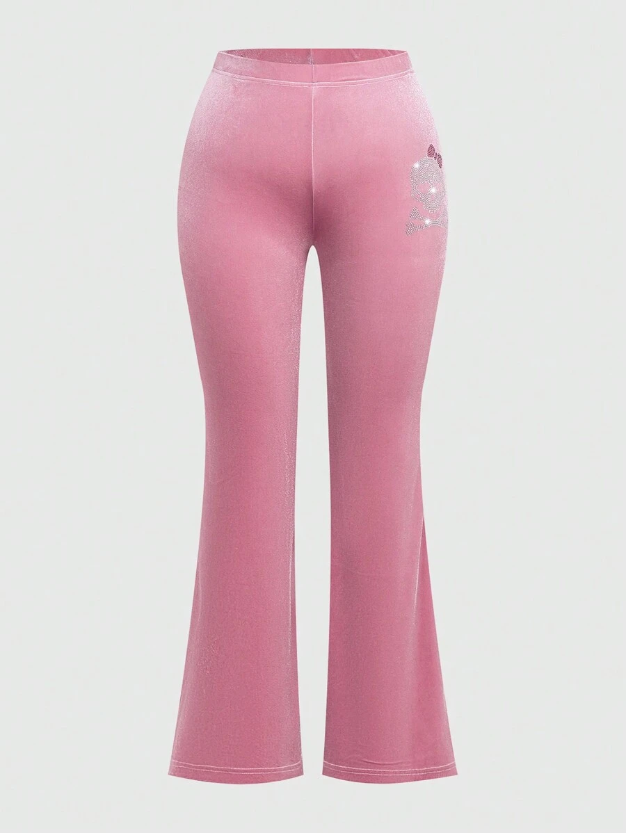 Kawaii Plus Size Velvet Bell Bottoms Pants With Cartoon Skull Pattern Embellished With Rhinestones