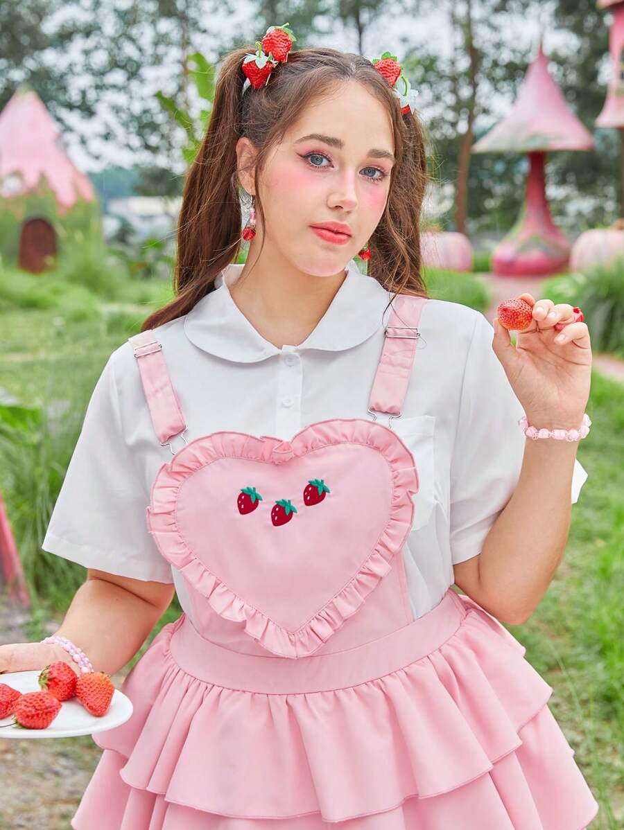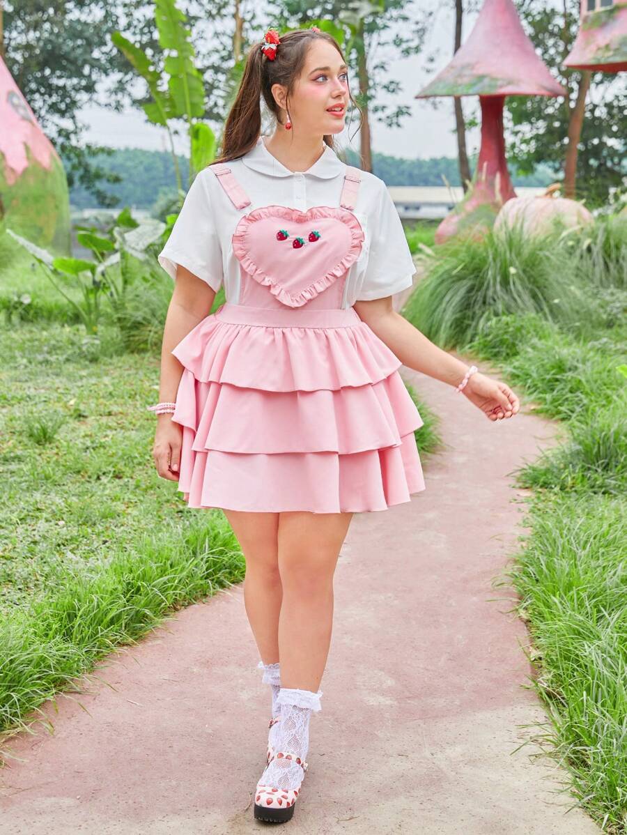 Kawaii Plus Strawberry Print Ruffle Trim Pinafore Dress