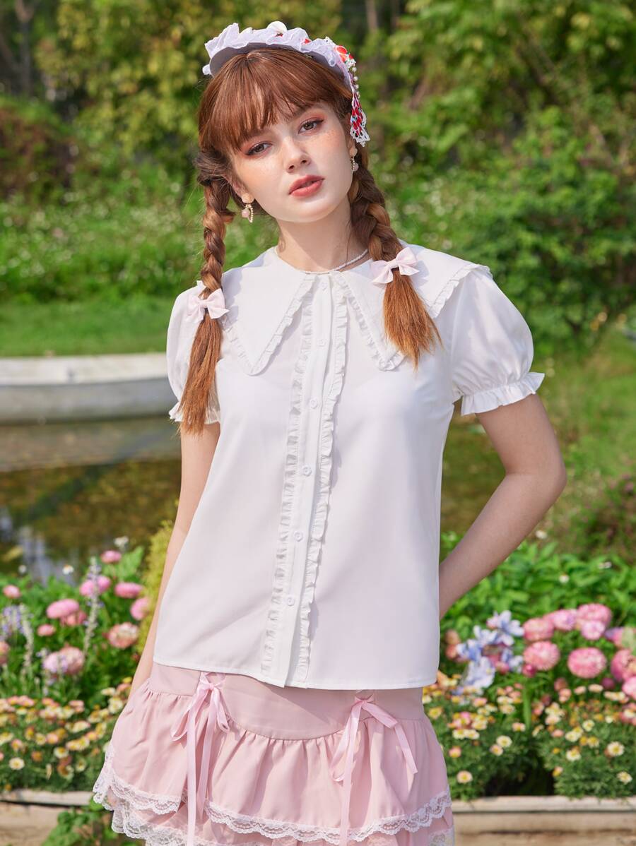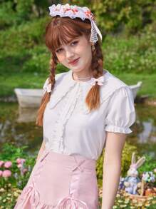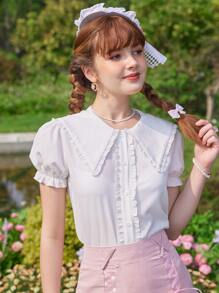 Kawaii Sailor Collar Frill Trim Puff Sleeve Shirt