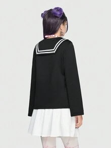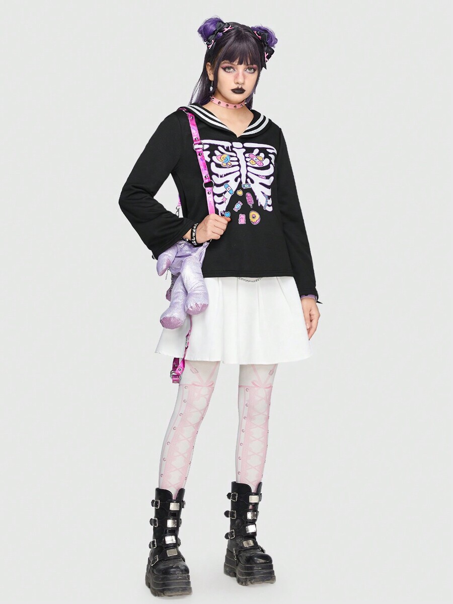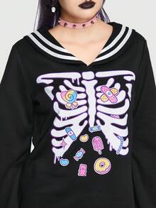 Kawaii Skeleton Print Sailor Collar Drop Shoulder Sweatshirt
