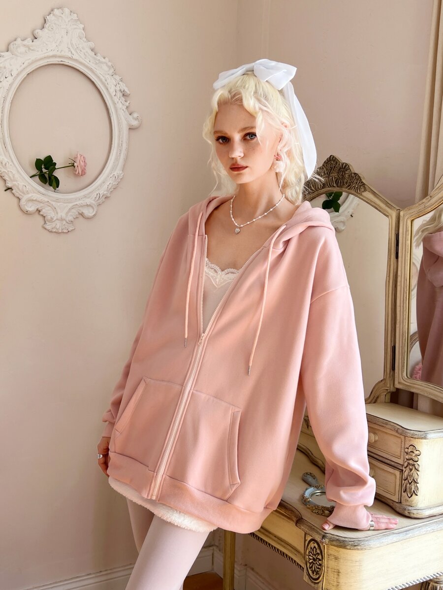 Kawaii Solid Zip Up Hoodie, School Pullover Fall Outfit