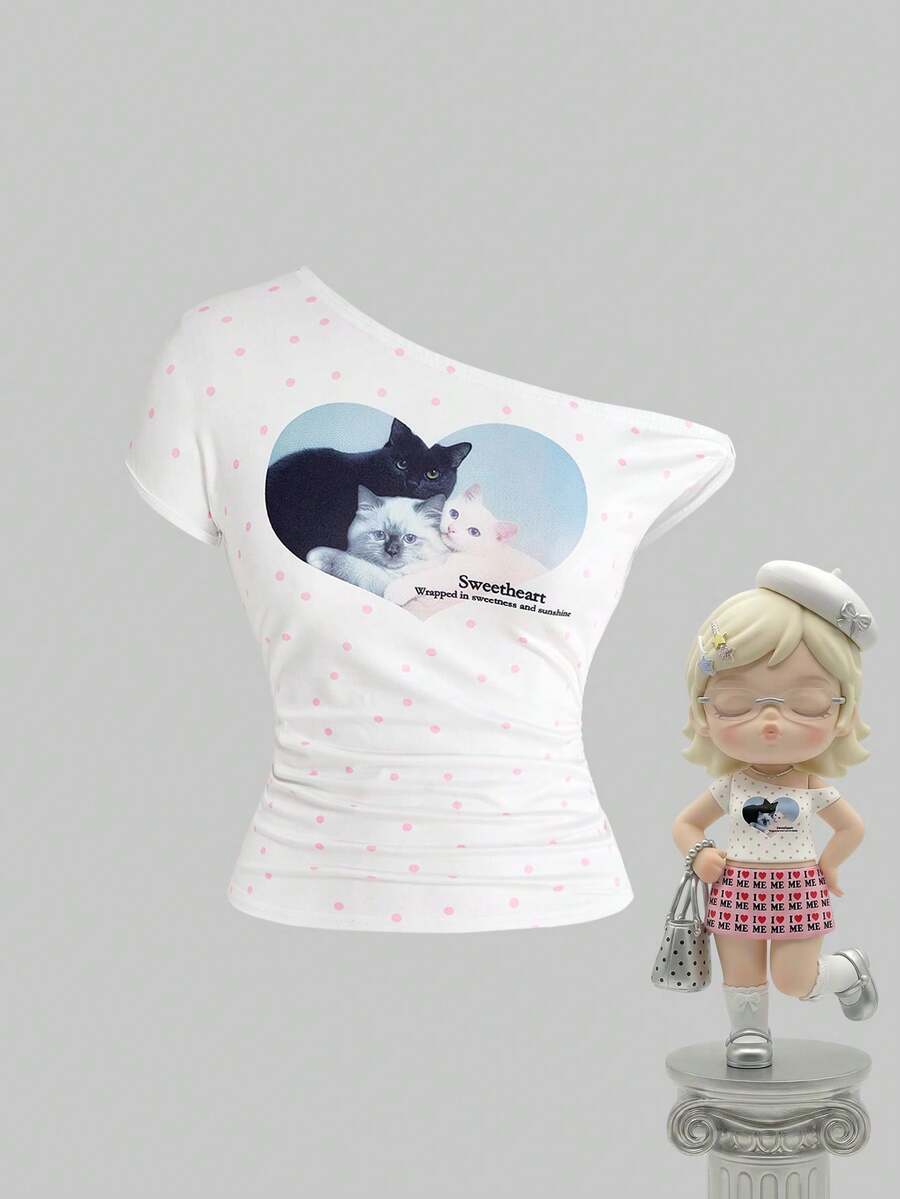 Kawaii Spring/Summer Vacation Cute Cat & Polka Dot Print Asymmetrical Shoulder Twist Sleeve T-Shirt, Suitable For Summer Beach, Graduation Ceremony, Music Festival, Concert, Date, Vacation And Other Occasions