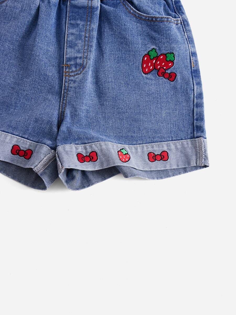 Kawaii Strawberry Embroidery Cuffed Hem Denim Shorts