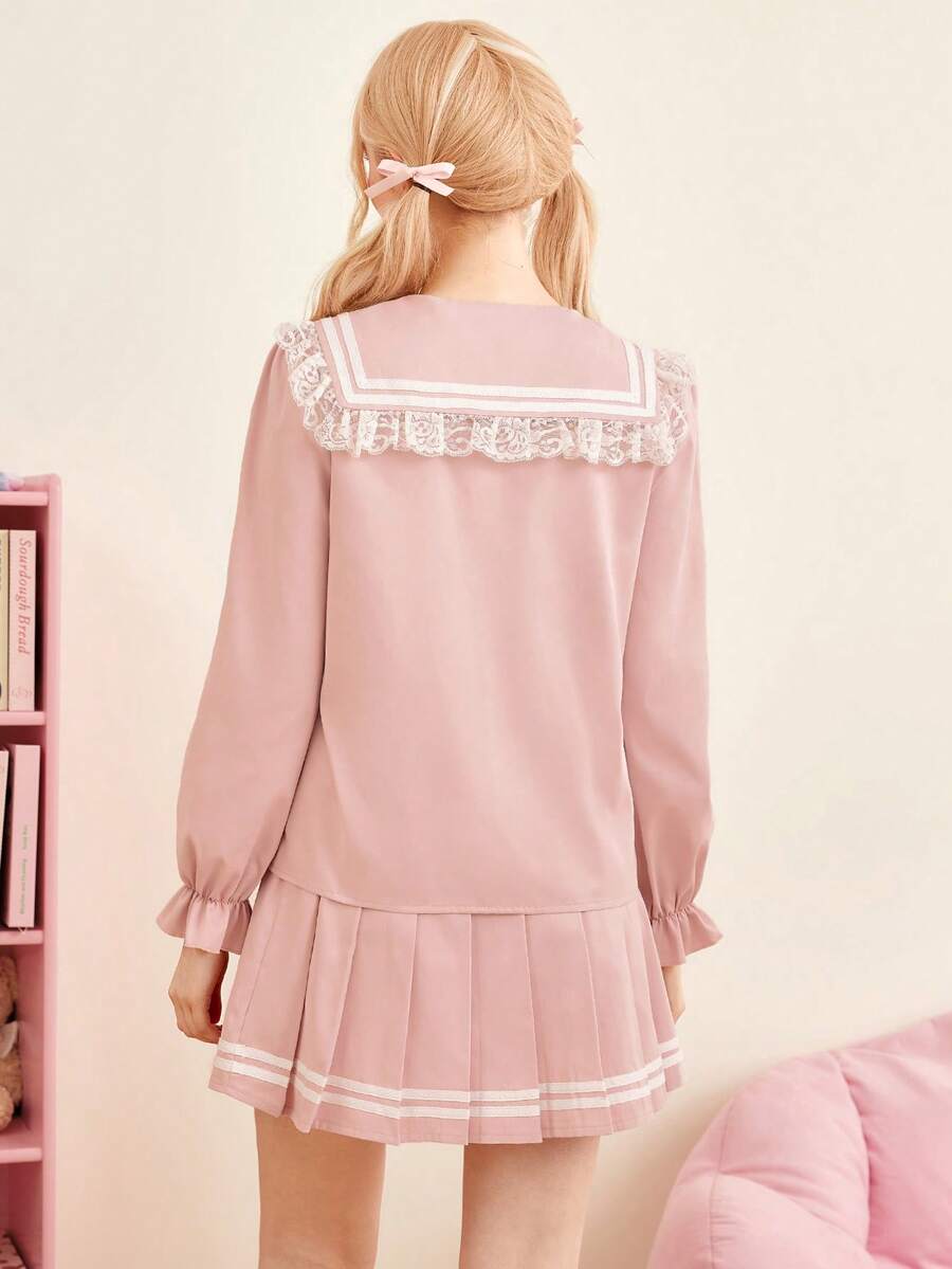 Kawaii Striped Contrast Lace Sailor Collar Shirt & Pleated Skirt