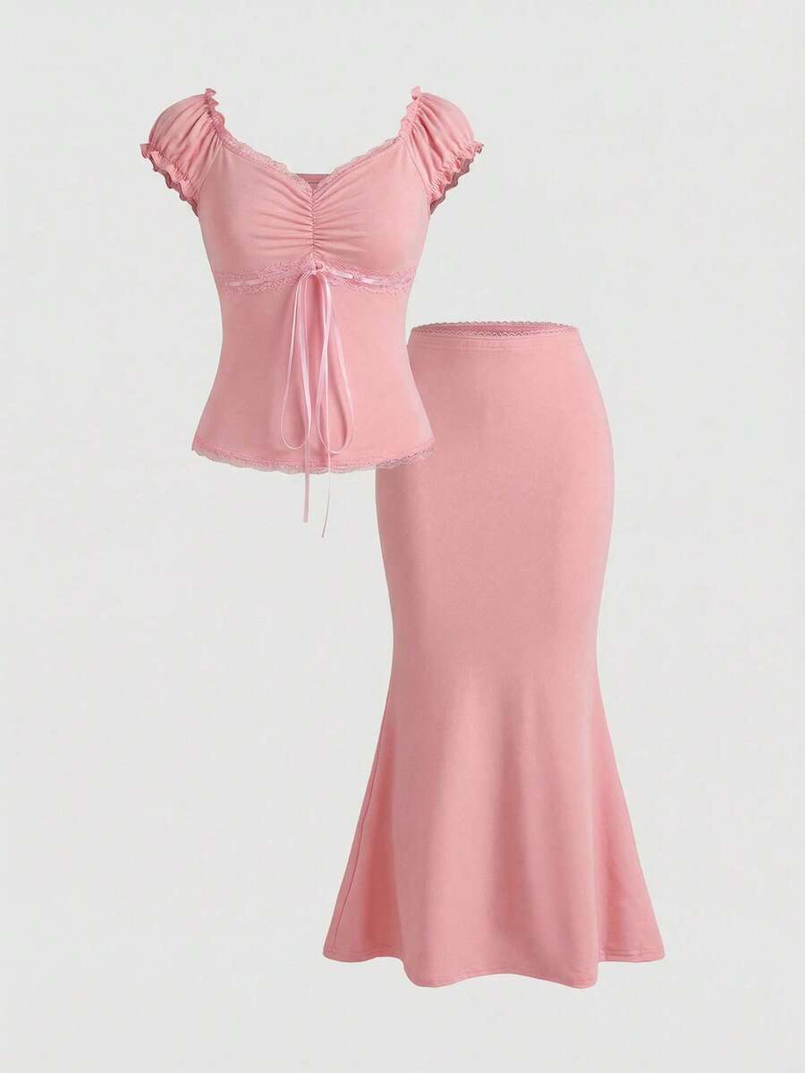 Kawaii Summer Outfits For Women: V-Neck Bowknot Decor Contrast Polka Dot Lace Patchwork Slim 2-Piece Set, Top + Skirt