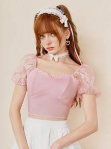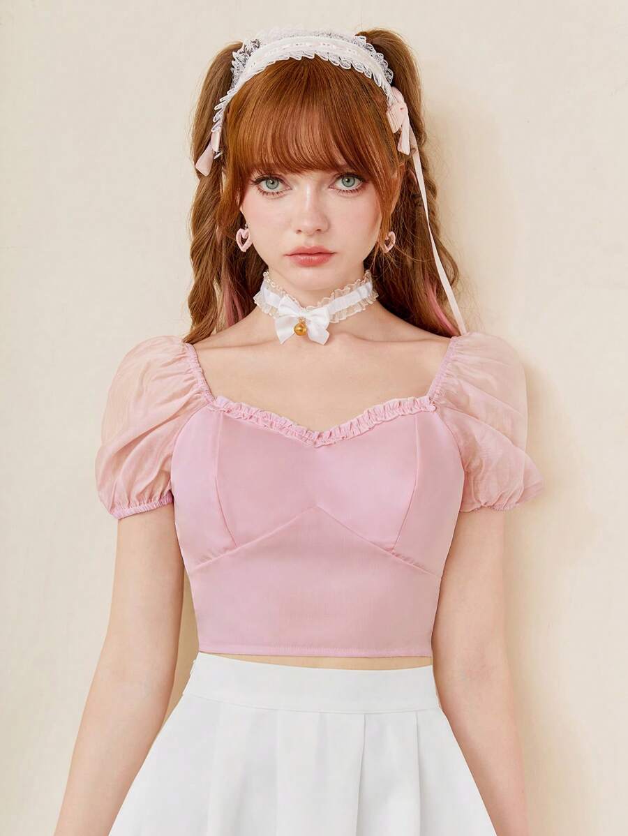 Kawaii Sweetheart Neck Puff Sleeve Crop Blouse