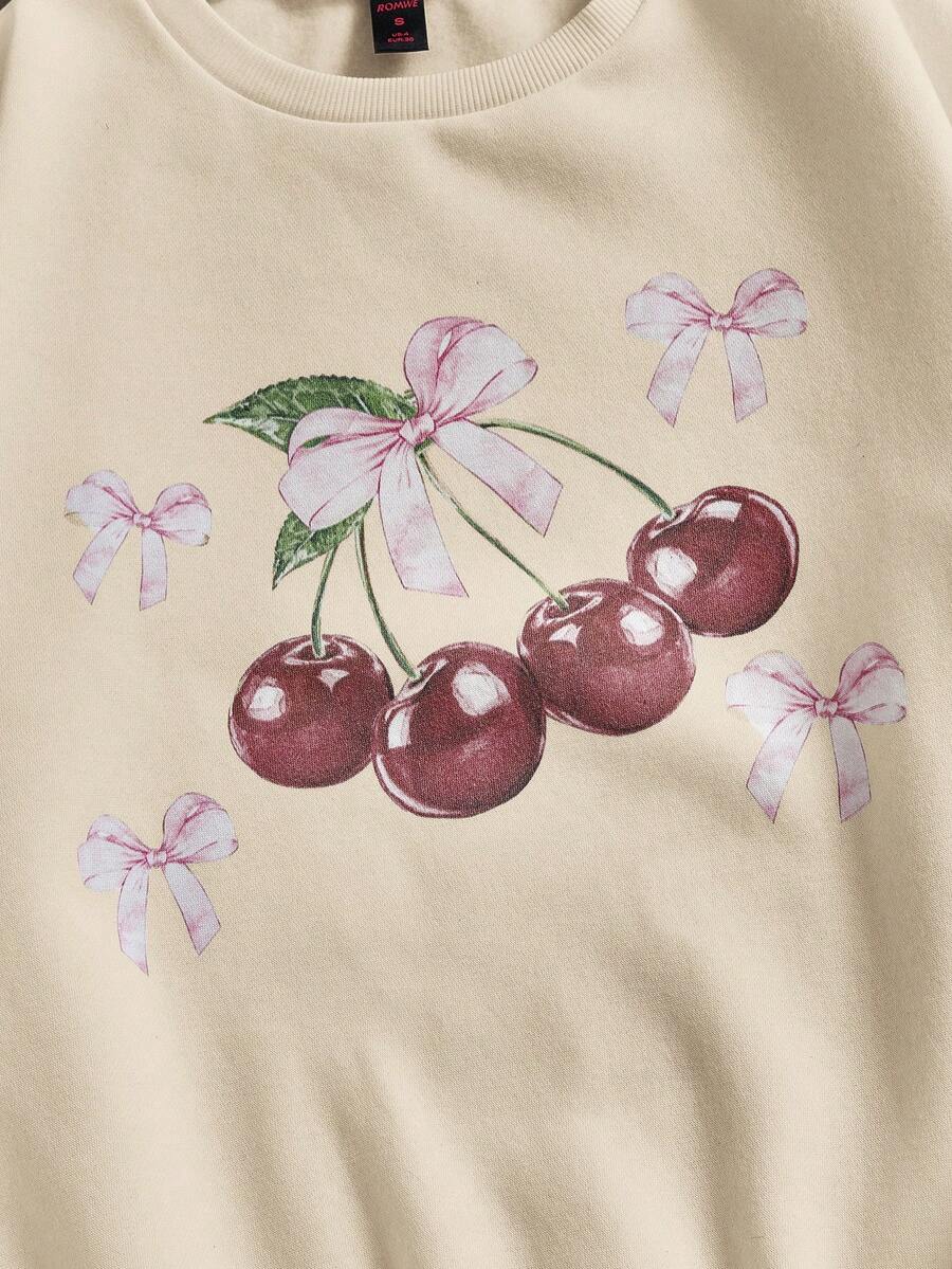 Kawaii Women Crew Neck Bowknot Cherry Print Long Sleeve Casual Loose Sweatshirt