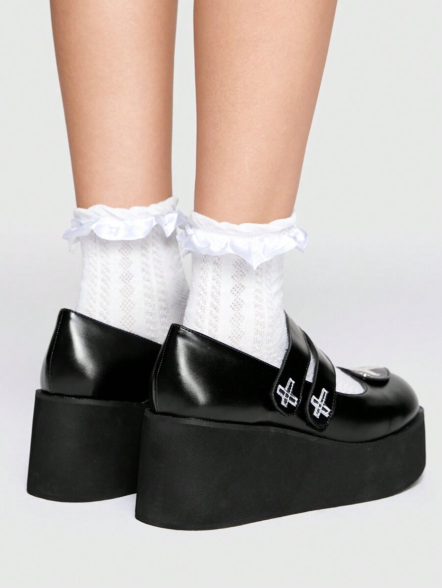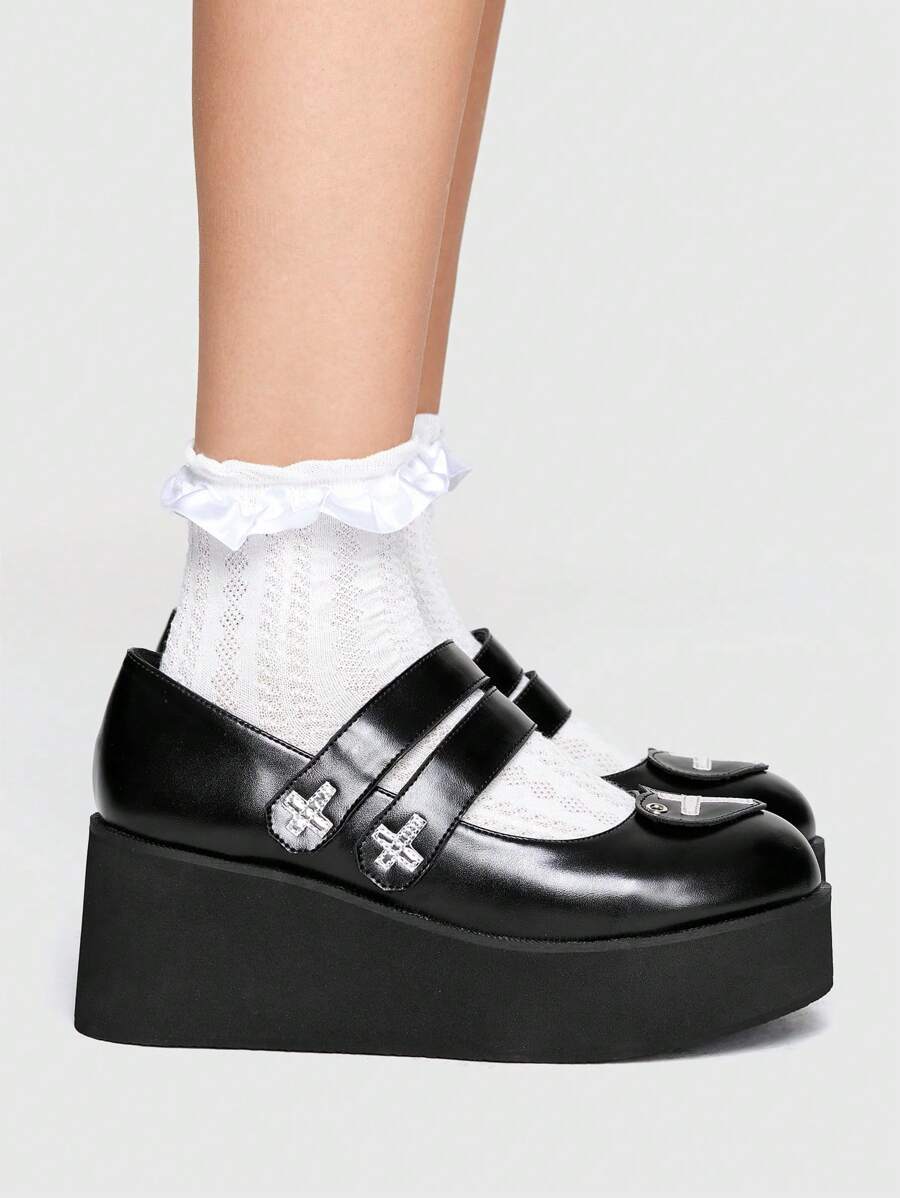 Kawaii Women Platform Round Toe Punk Style Thick Sole Buckle Strap High Heels Shoes, Black New Year Holiday