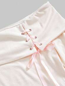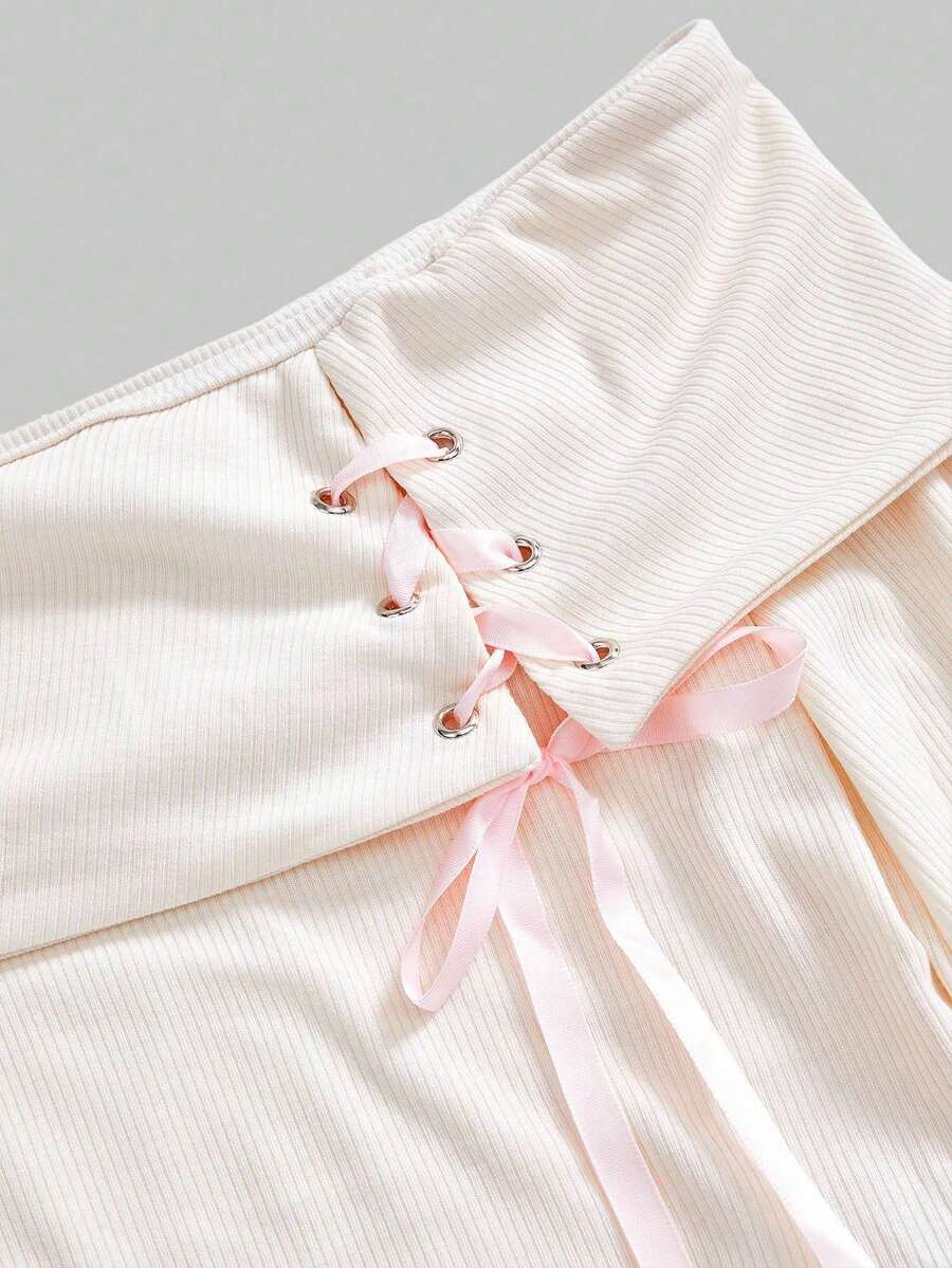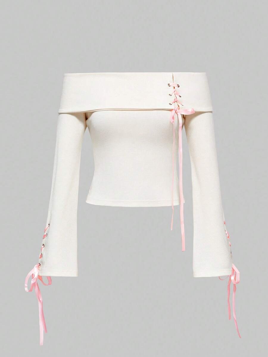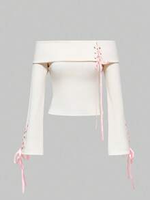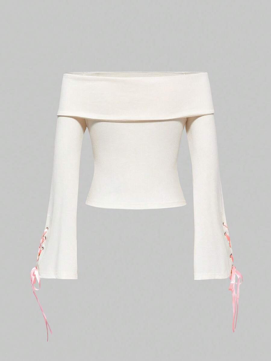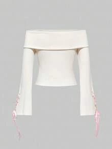 Kawaii Women Sweet Casual Pure Linen Tie Front Top With Off Shoulder And Flare Sleeves