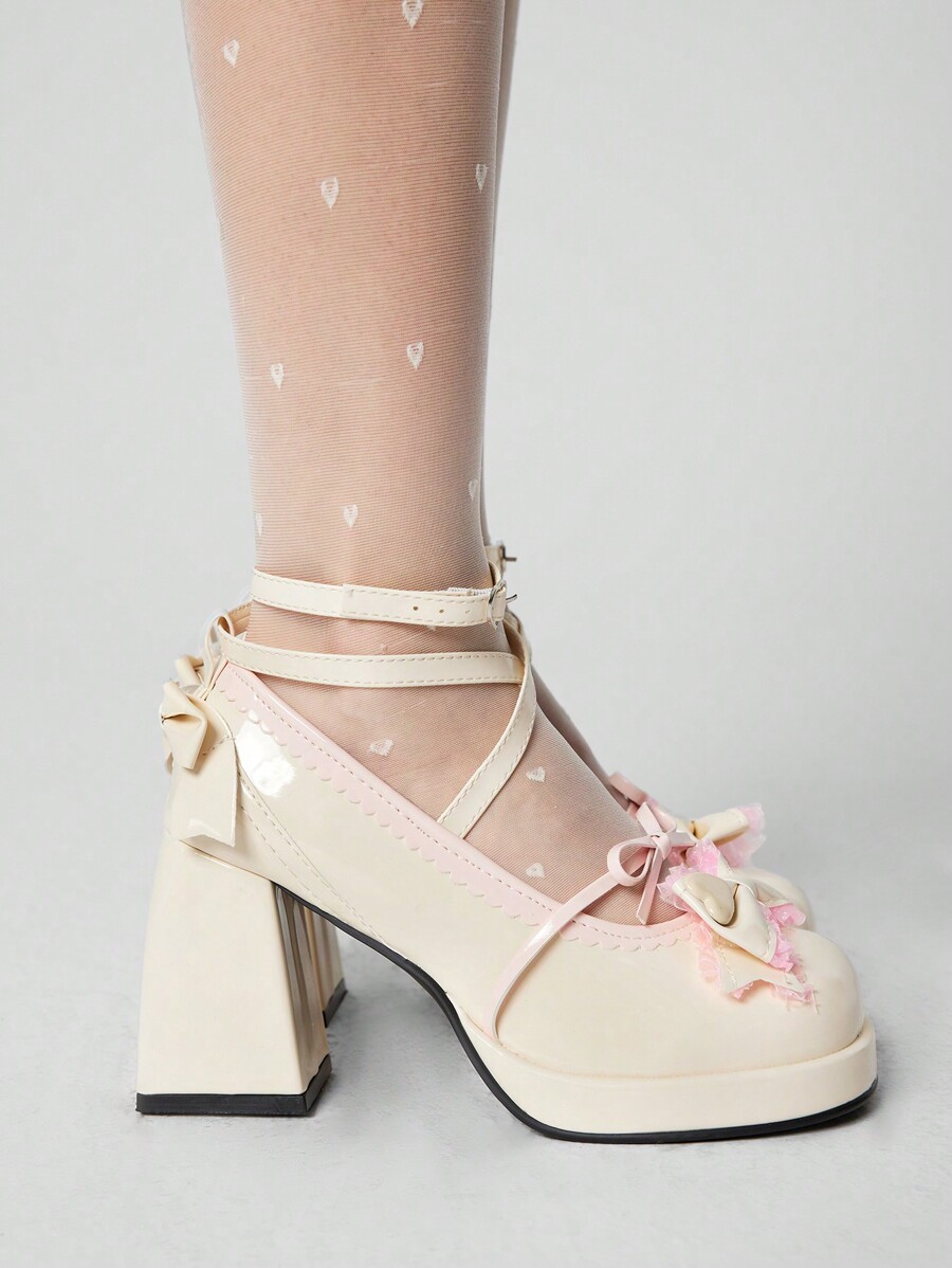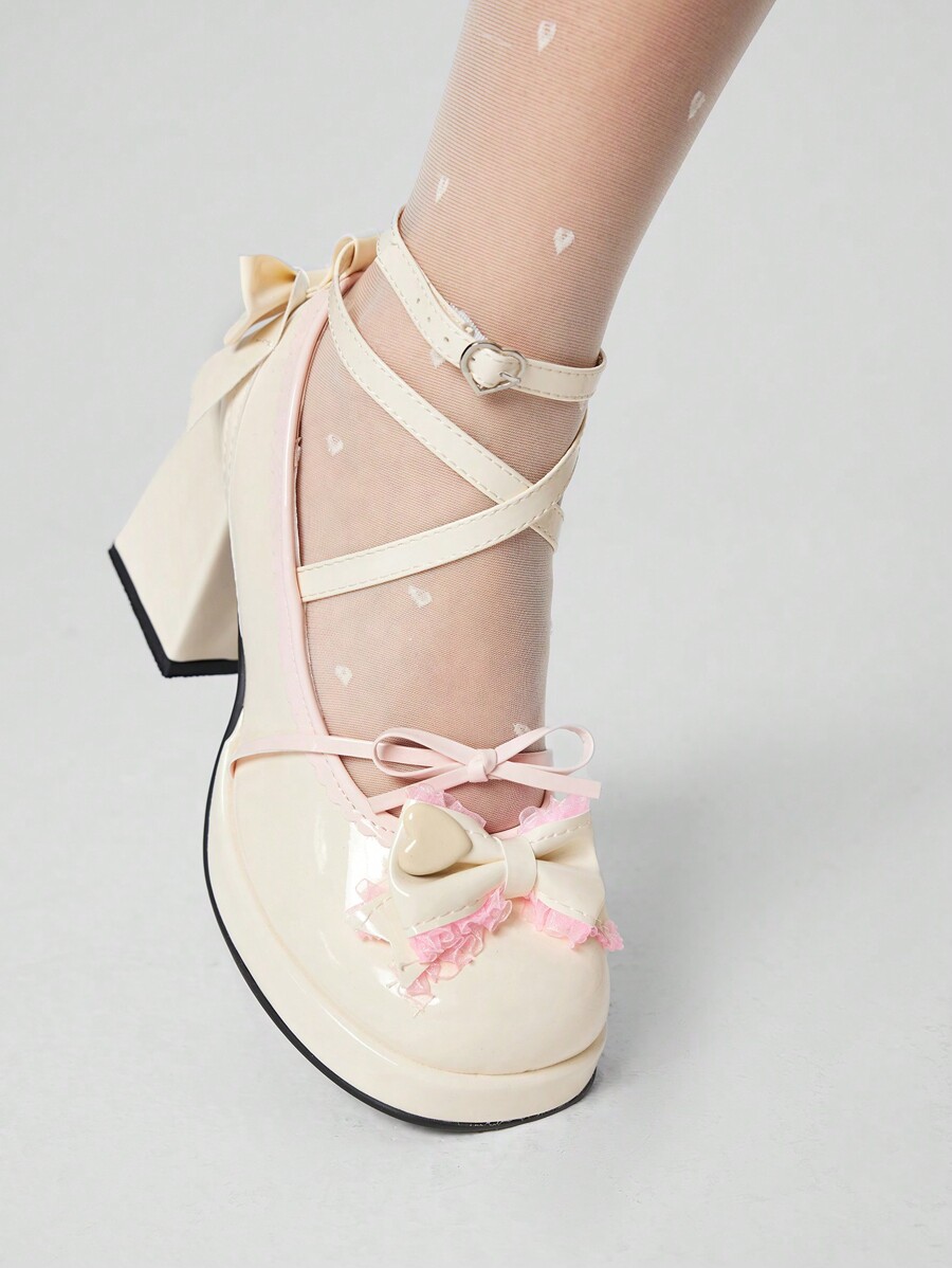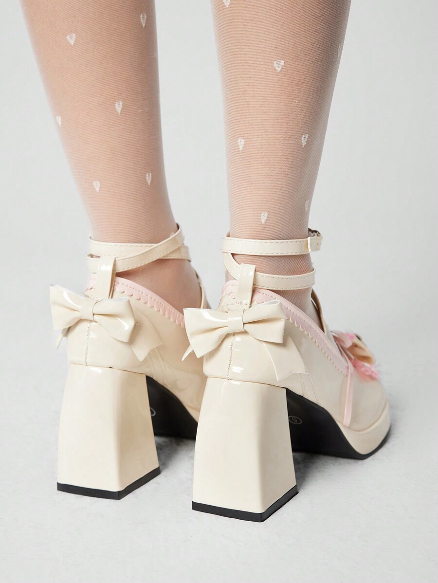 Kawaii Women's Beige Mary Jane Shoes, Lolita Bow Design Gothic Pumps, Closed Toe Strap High Heel Formal Shoes