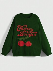 Kawaii Women's Cherry Patterned Long Sleeve Sweater With Letter Print