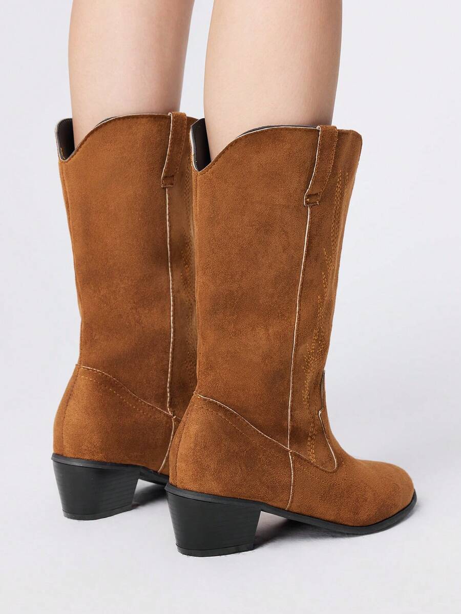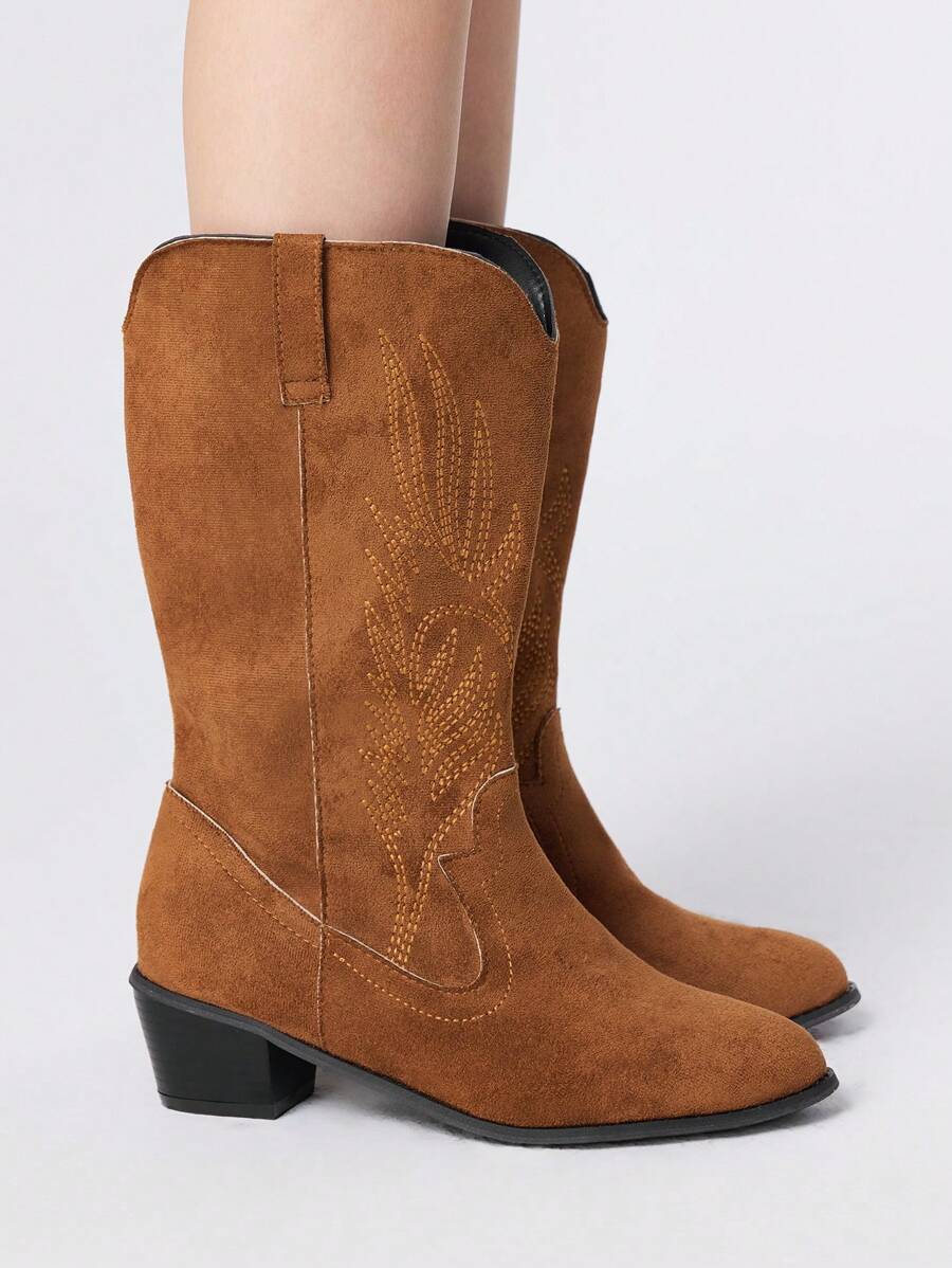 Kawaii Women's Cowboy Boots With Embroidery, Mid-Calf, Nature Style, Brown Faux Suede Western Boots