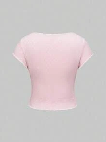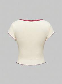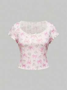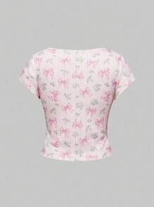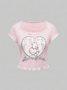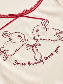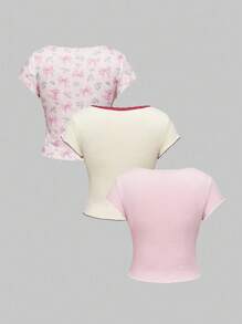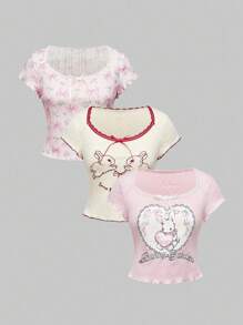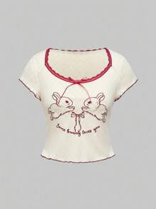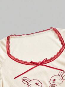Kawaii Women's Cute Rabbit Bow Embroidered Graphic Colorblock Crew Neck Basic T-Shirt Set