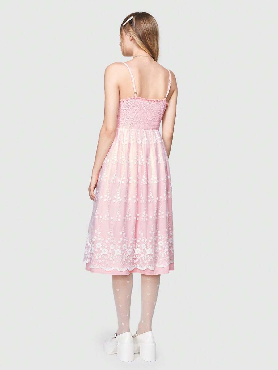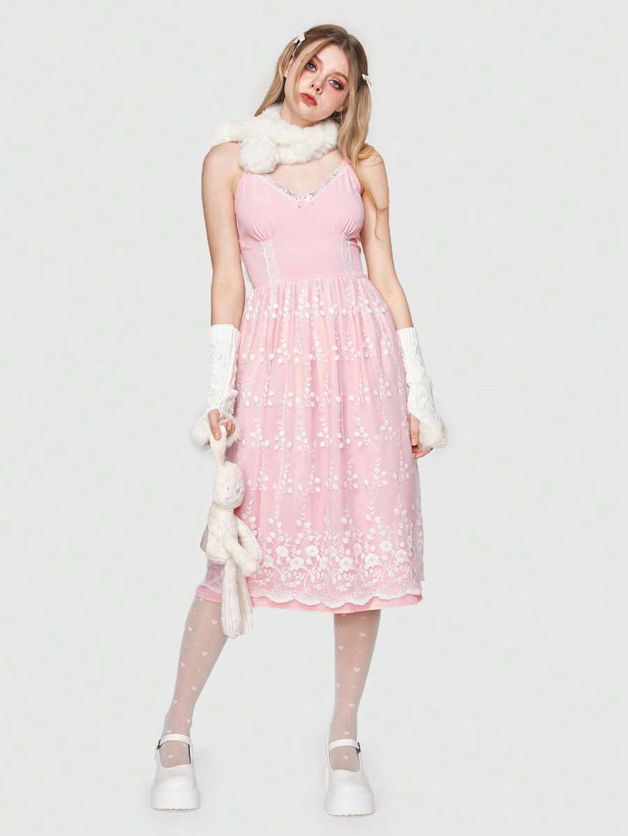 Kawaii Women's Elegant Floral Embroidery Cinched Waist Spaghetti Straps Dress