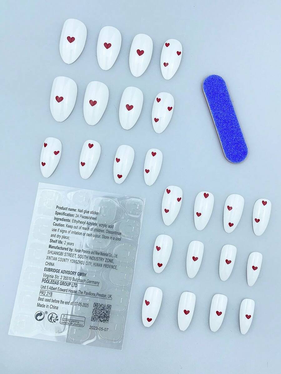 Kawaii (in Stock) 24pcs Almond Shaped Heart Pattern False Nails & Free Jelly Glue