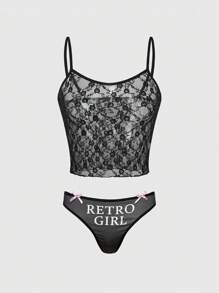 J-Fashion Lace Cami Top With Letter Print G-String Underwear Set